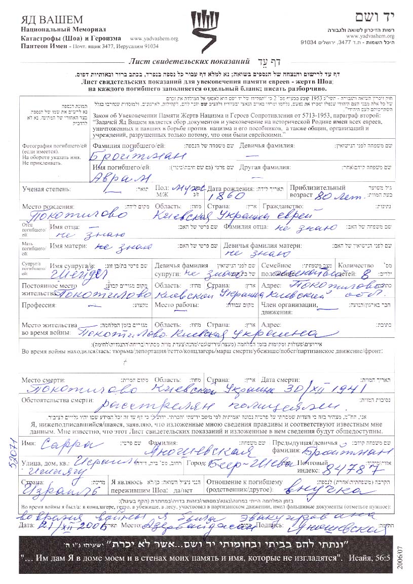 Avraham Broitman was born in Kopenkovatoye, Ukraine (USSR). Prior to WWII he lived in Pokotilovo, Ukraine (USSR). Avraham was murdered in the Shoah. Place of death: Pokotilovo, Ukraine (USSR), 30/12/1941.