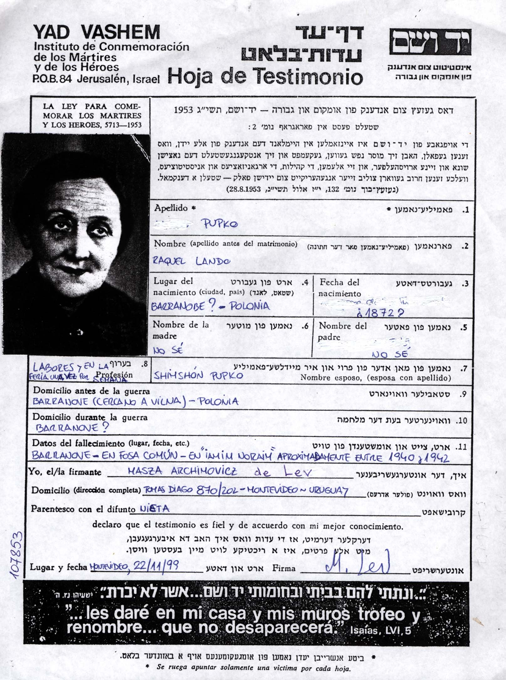 Pupko Raquel 1872 Baranowo, Poland Page of Testimony