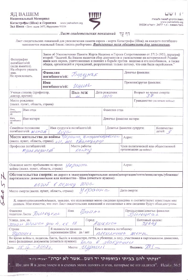 Bereznyak | Ishika | 1902 | Novo Vitebsk, Ukraine (USSR) | Page of Testimony |