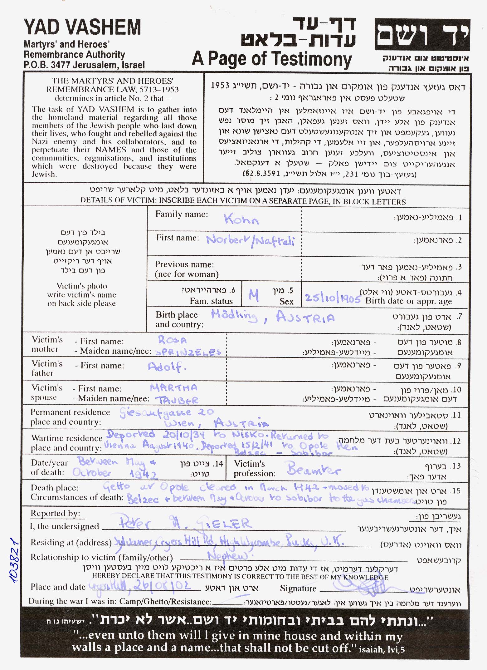 | Kohn | Norbert Naftali | 1905 | Wien, Austria | Page of Testimony |