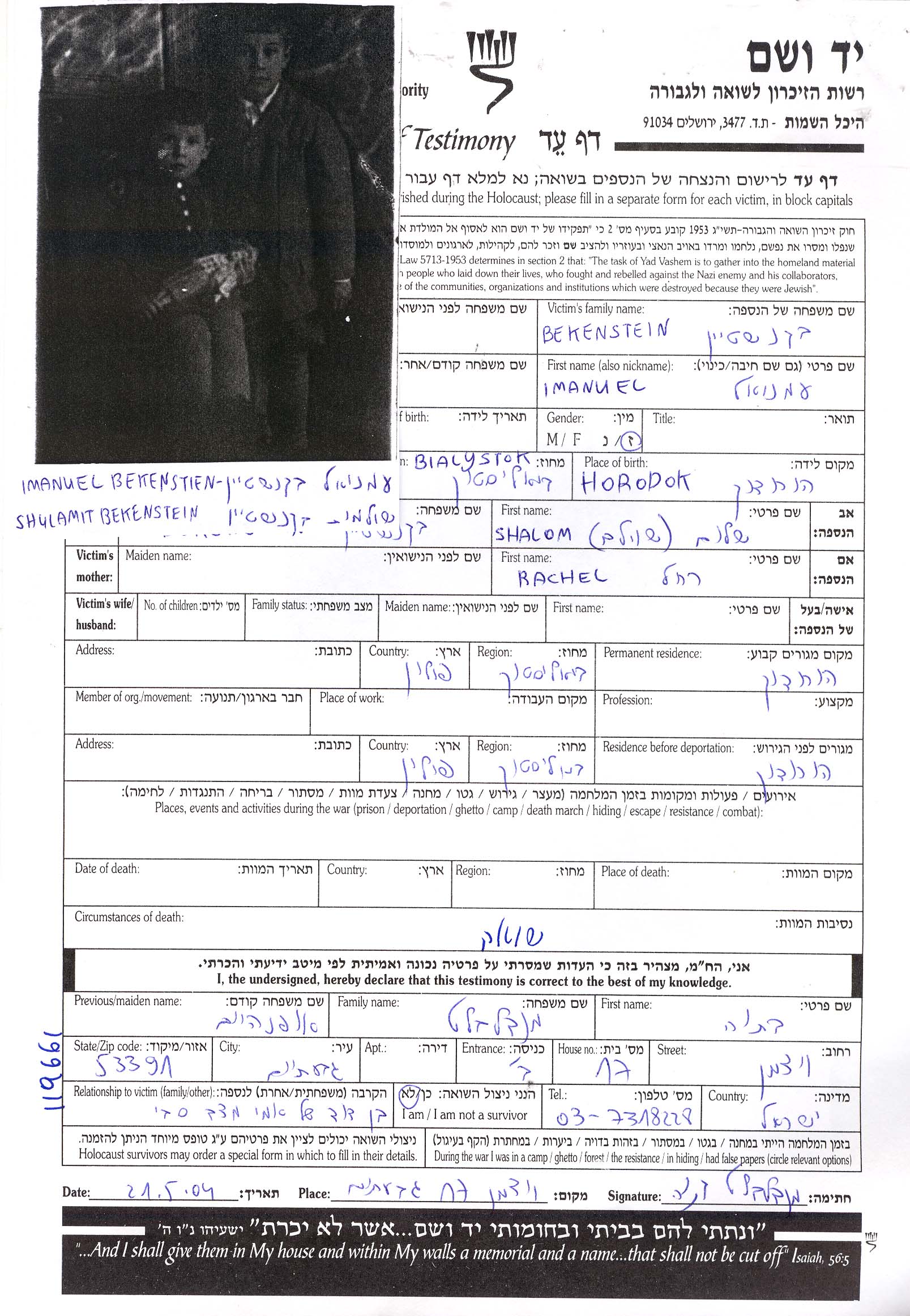 Bekenstein Imanuel 1928 Horodok, Poland Page of Testimony