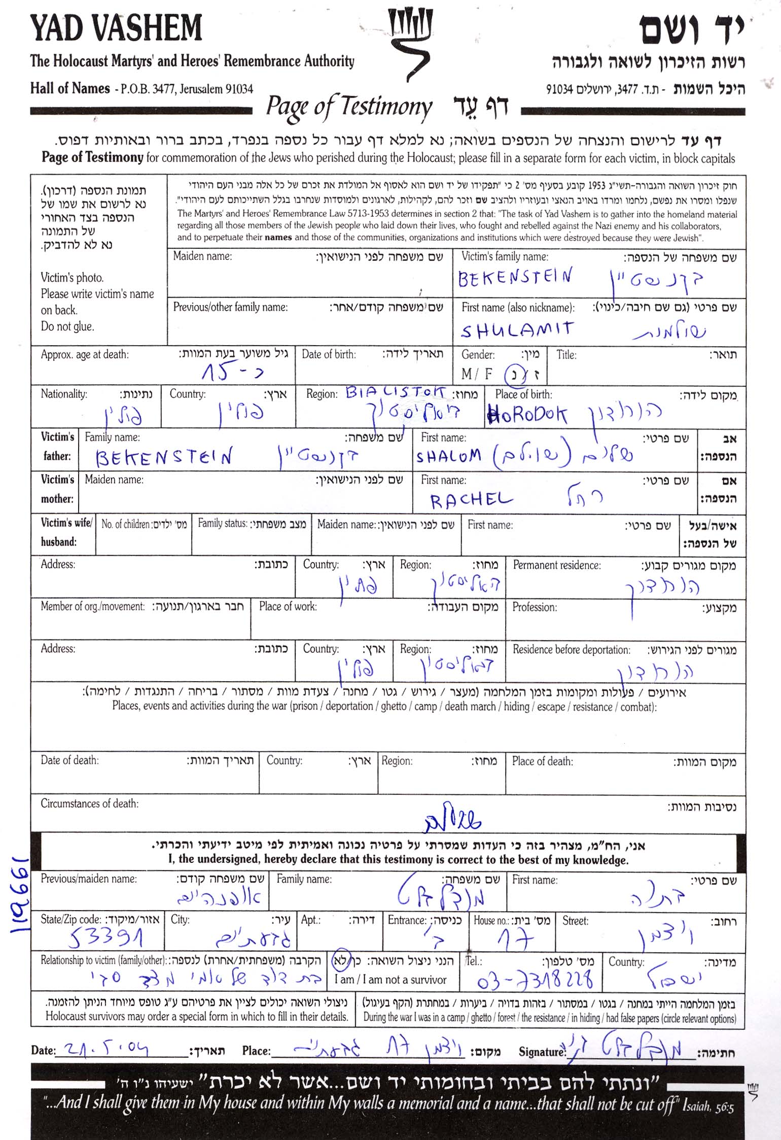 Bekenstein Shulamith 1930 Bialystok, Poland Page of Testimony