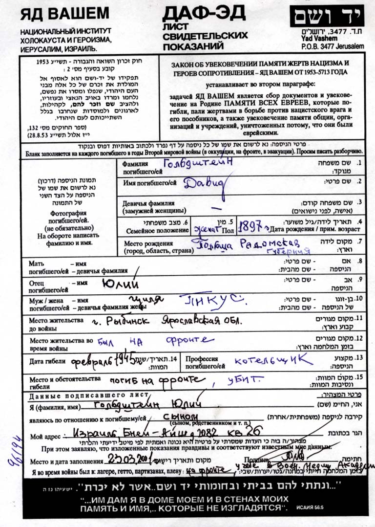 David Goldsztejn Goldshein was born in Kielce, Poland, 1898. Prior to WWII he lived in Rybinsk, Russia (USSR). David was killed in military service in WWII. Place of death: the Soviet armed forces, 1944.