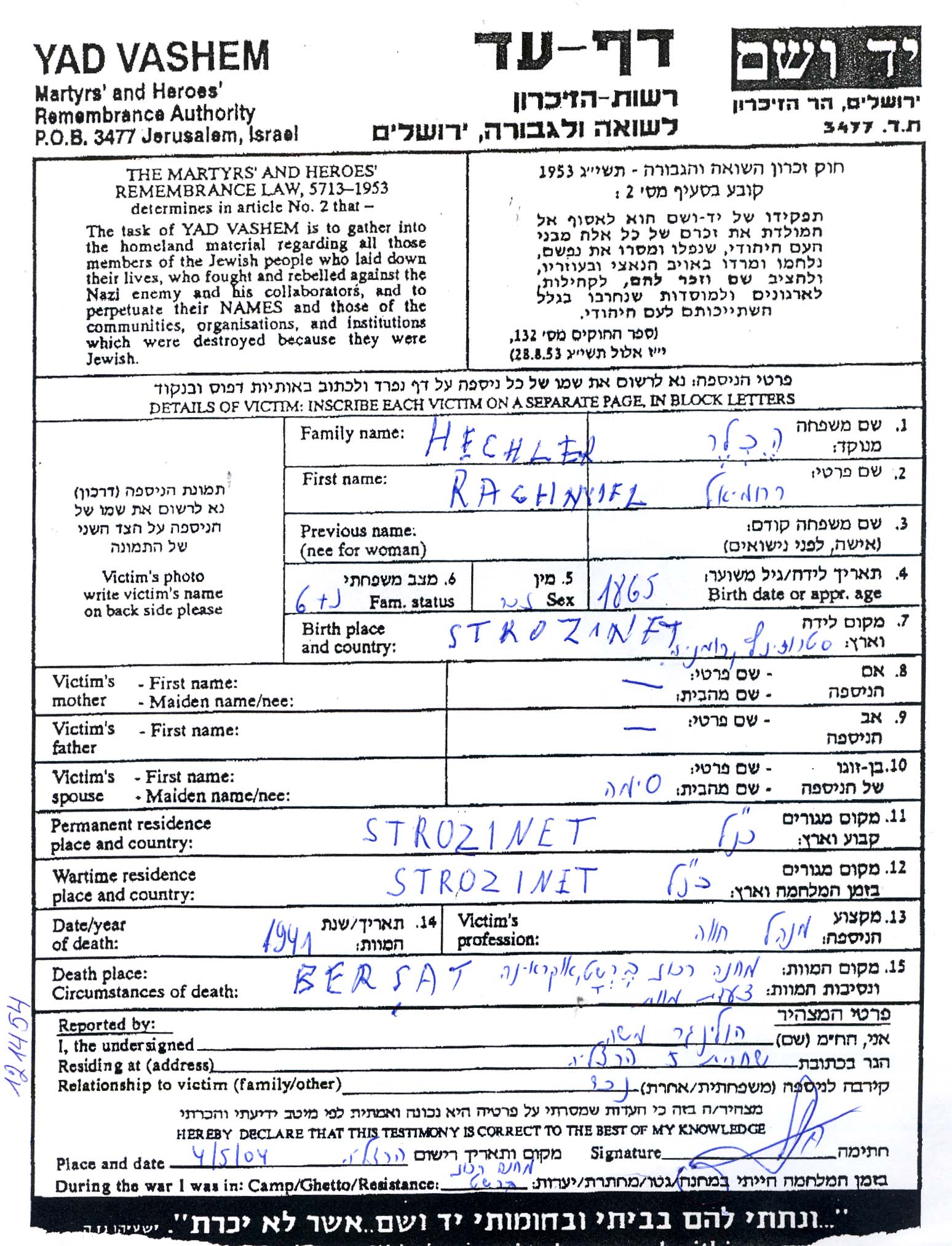 Yerakhmiel Hechler was born in Austro-Hungarian Empire, 1865. He was an agriculturist. Prior to WWII he lived in Storojinet, Romania. Yerakhmiel was murdered in the Shoah. Place of death: Bershad, Ukraine (USSR), 1941.