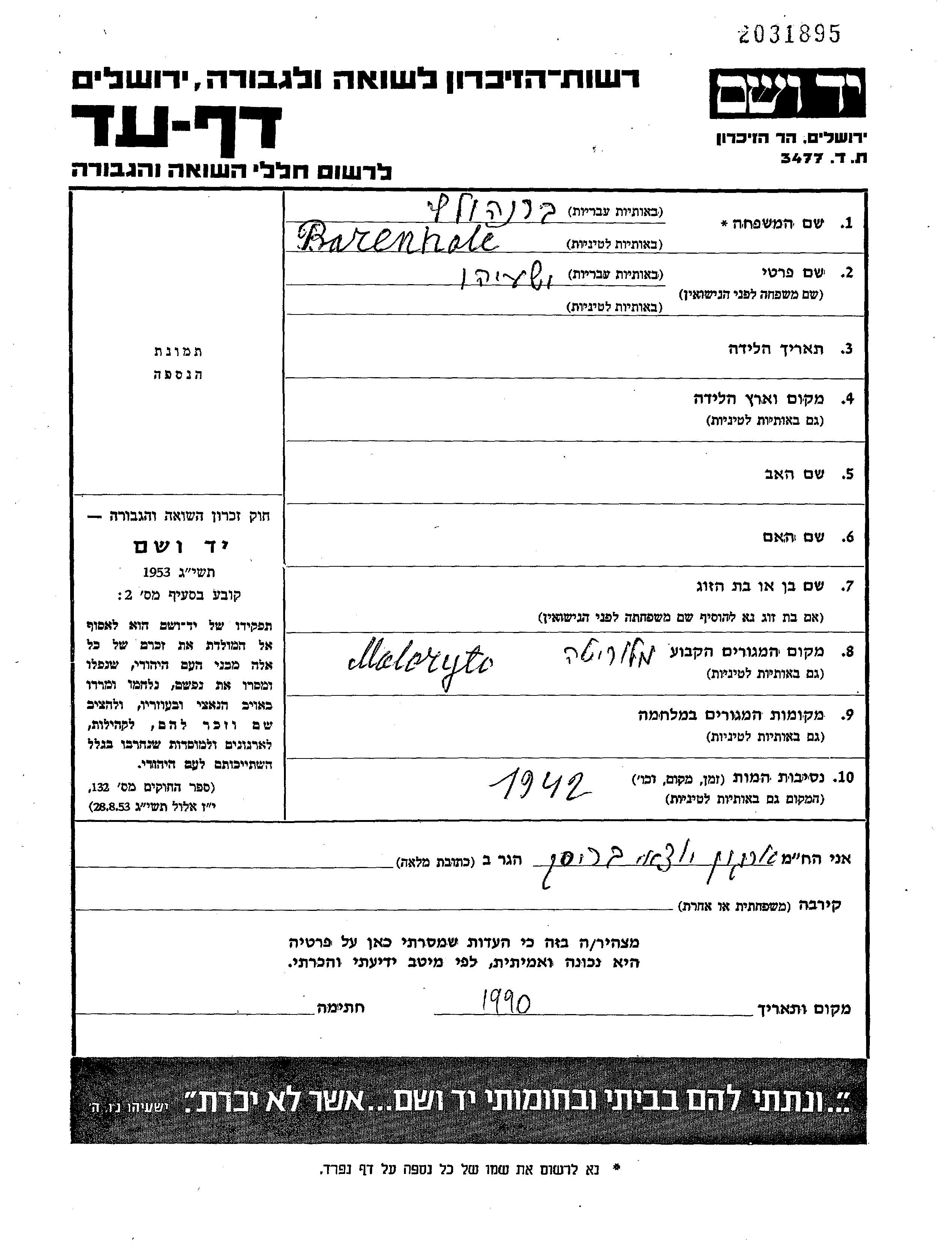 Barenholc Yeshayahu Maloryta, Poland Page of Testimony