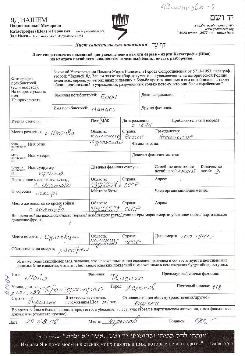 Yad Vashem - Pages of Testimony Names Memorial Collection