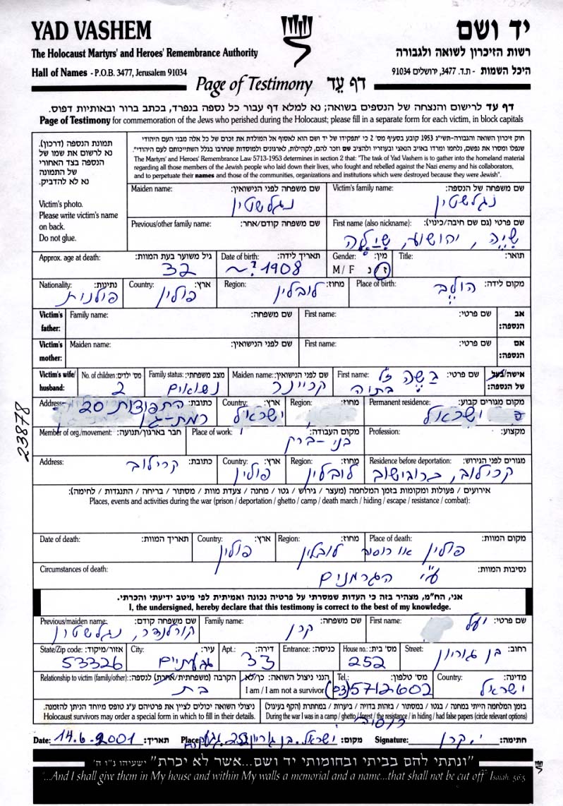 Jehoschua Shaia Shila Nagelstein was born in Krylow, Poland. Prior to WWII he lived in Krylow, Poland. Jehoschua Shaia Shila was murdered in the Shoah. Place of death: Russia (USSR), 1945.