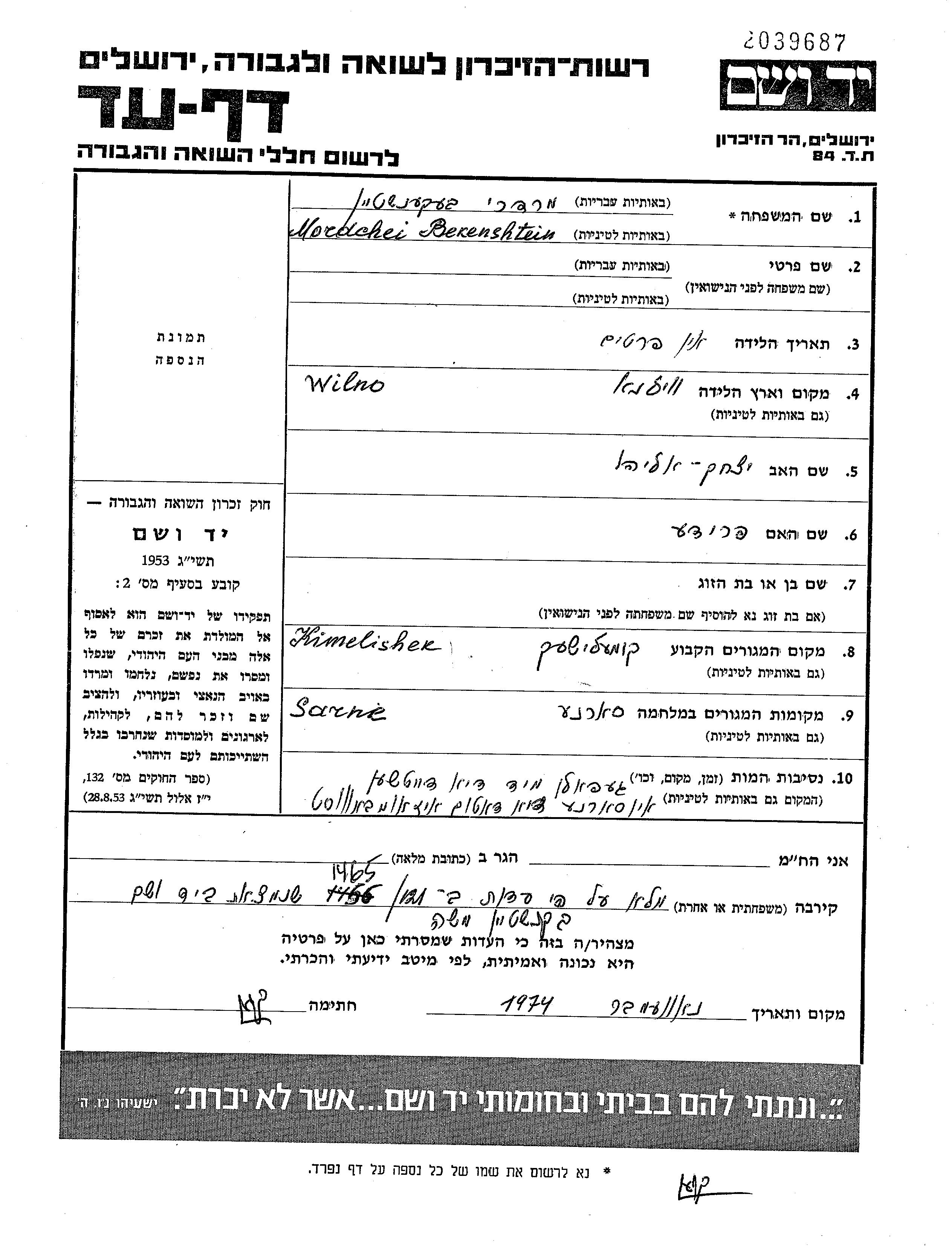 Mordchei Bekenshtein was born in Wilno, Poland to Yitzkhak Eliahu and Frida. Prior to WWII he lived in Kimeliszki, Poland. During the war he was in Sarny, Poland. Mordchei was murdered in the Shoah. Place of death: Sarny, Poland.