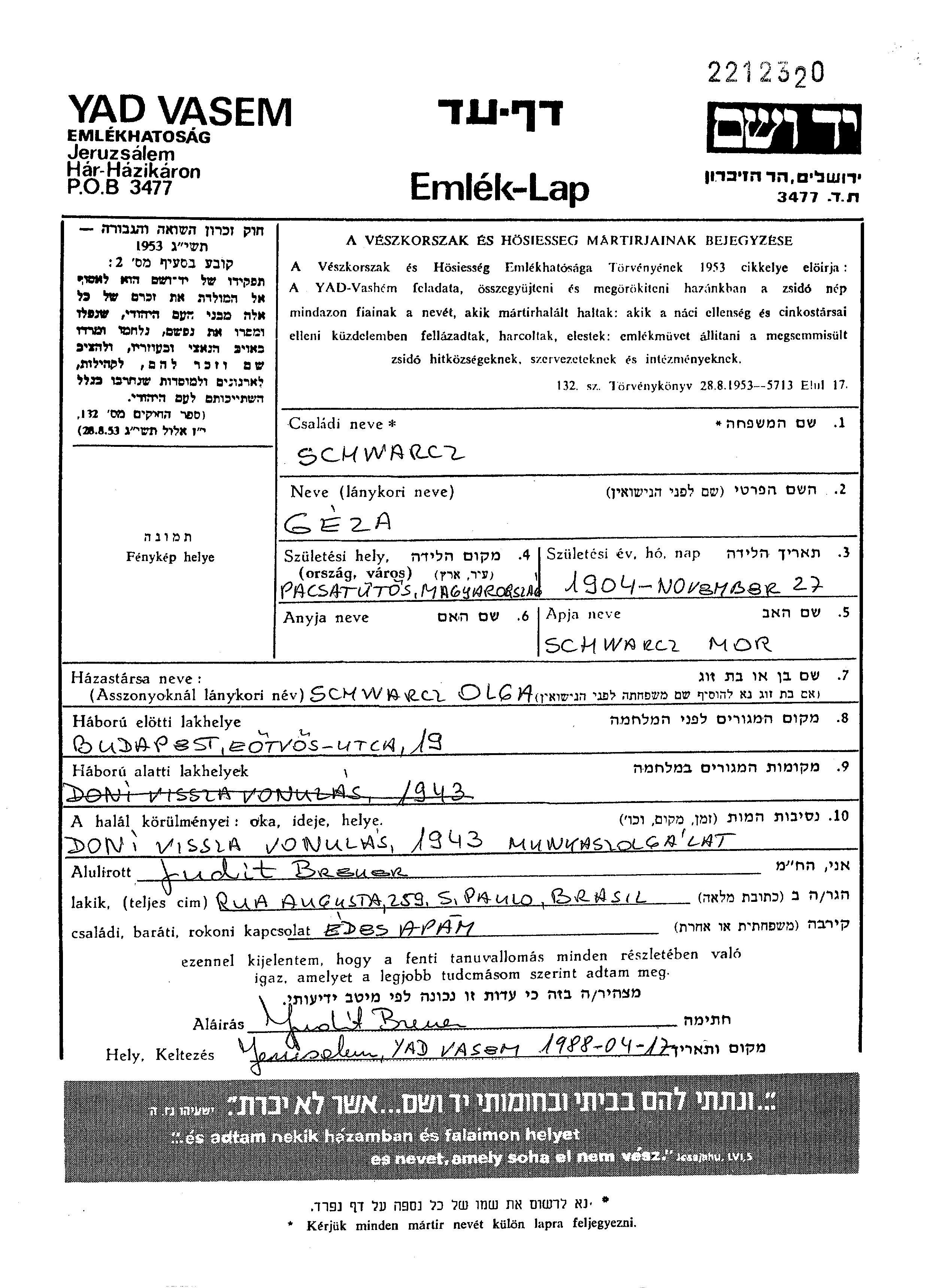 Schwarcz Geza 1904 Budapest, Hungary Page of Testimony