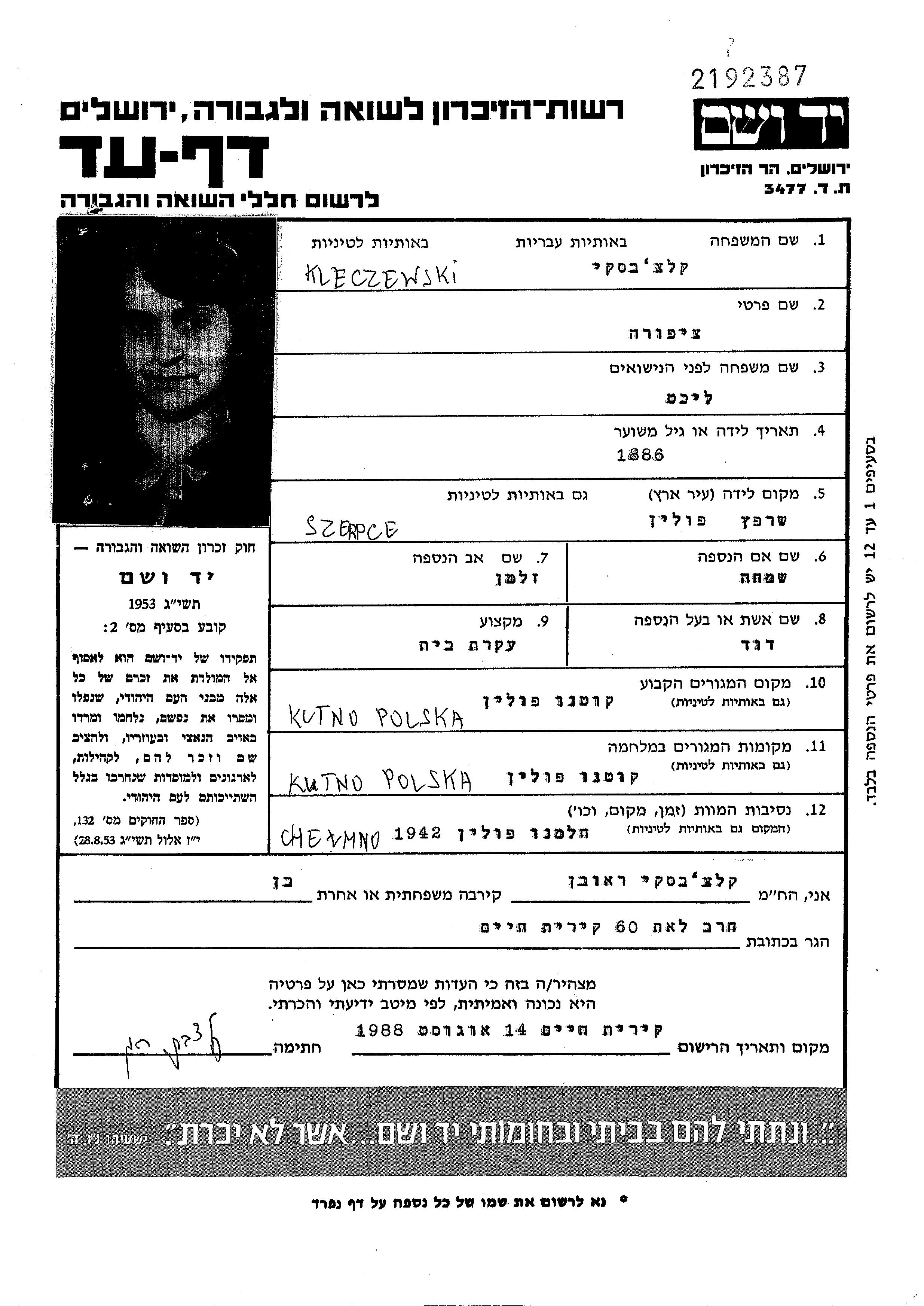| Kleczewski | Tzipora | 1886 | Kutno, Poland | Page of Testimony |