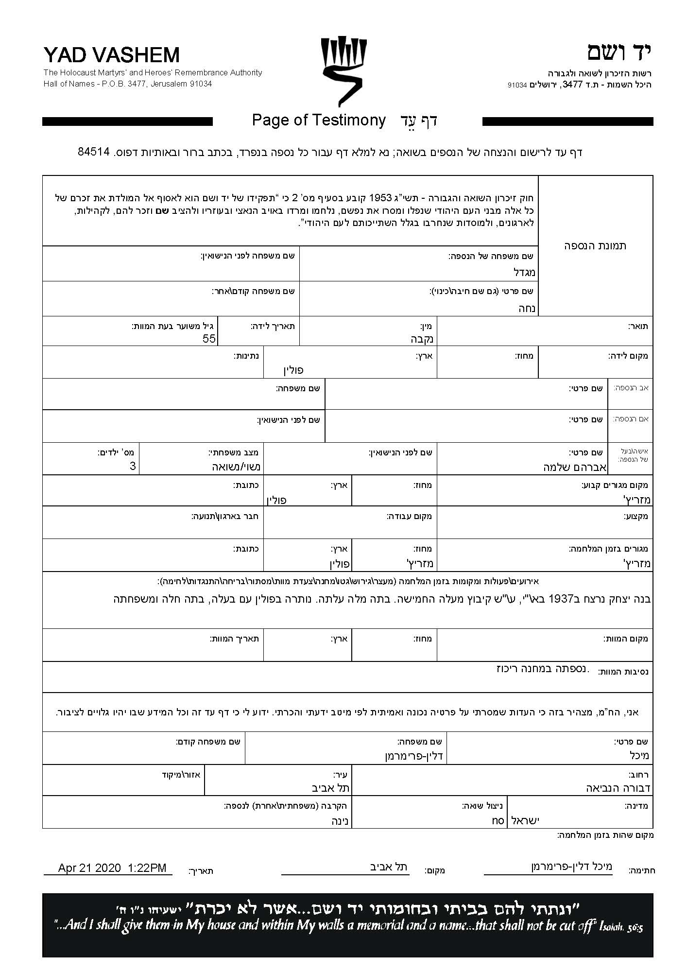 Nekha Migdal. She was married to Avraham Shlomo. Prior to WWII she lived in Miedzyrzecz, Poland. During the war she was in Miedzyrzecz, Poland.
