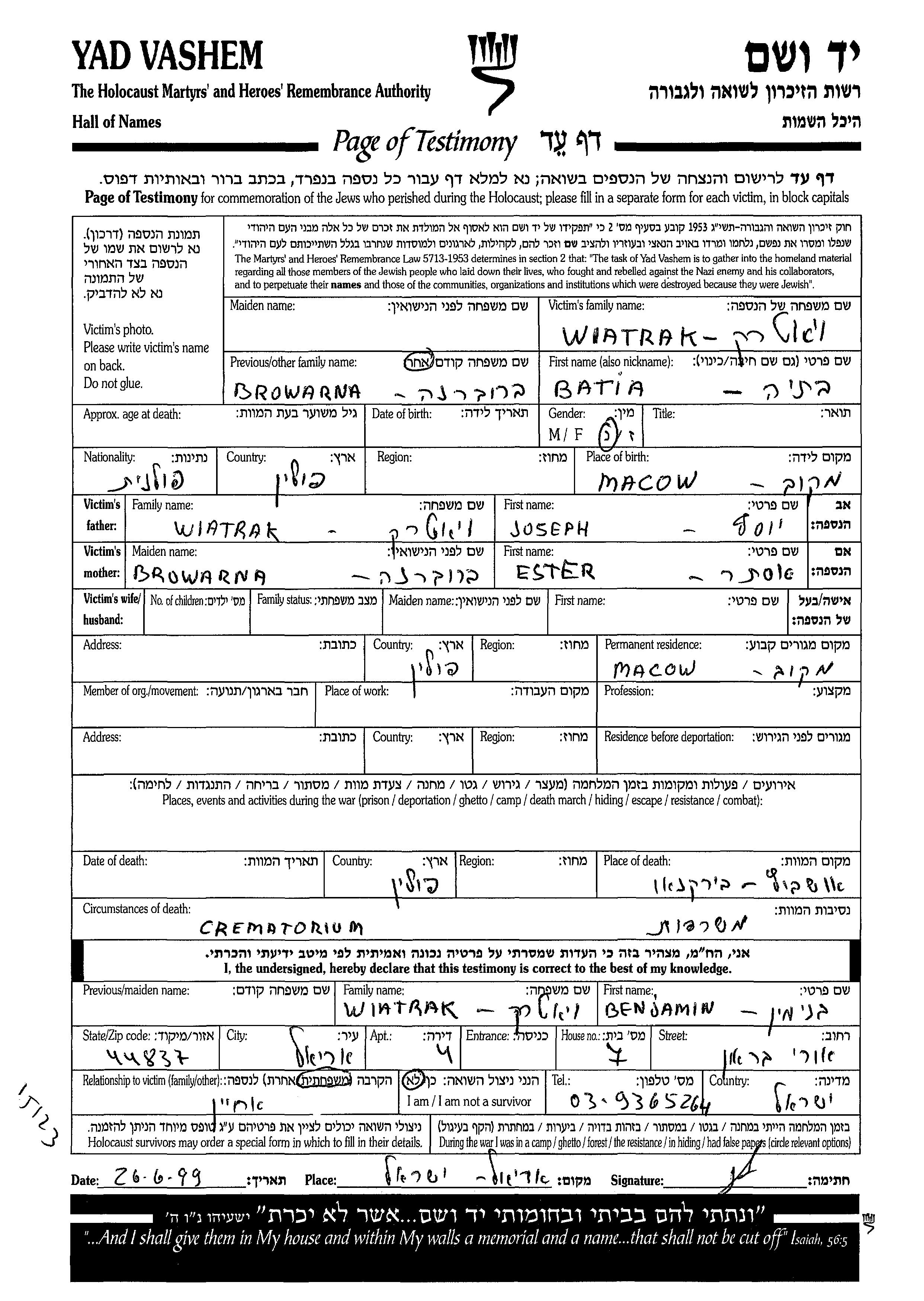 Wiatrak Batia Maków, Poland Page of Testimony
