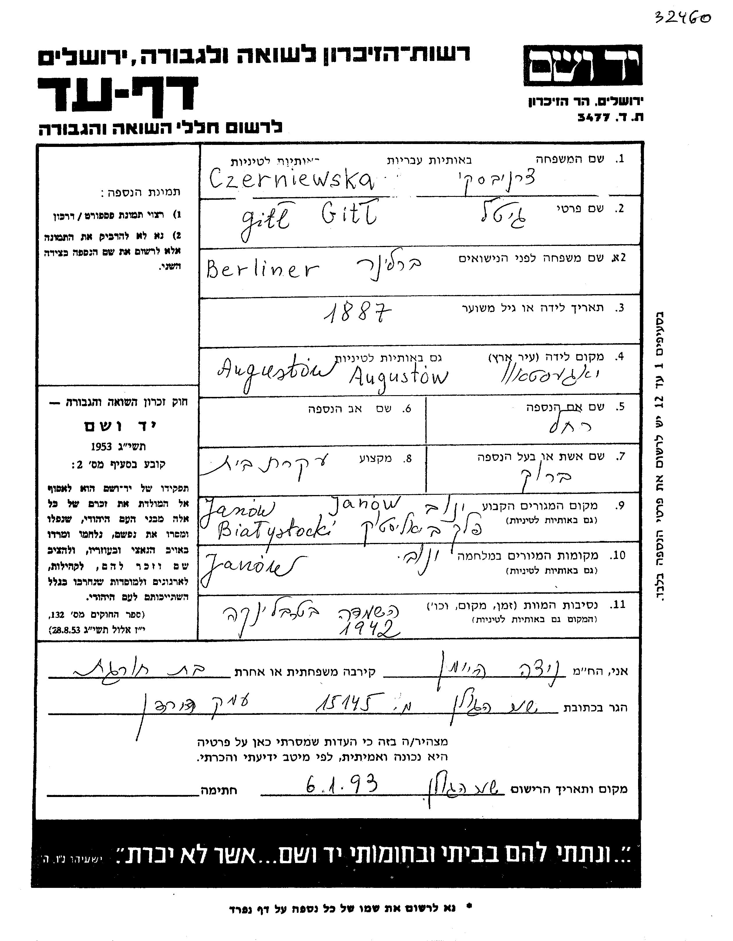 Czerniewski Gitla Janow Sokolski, Poland Page of Testimony