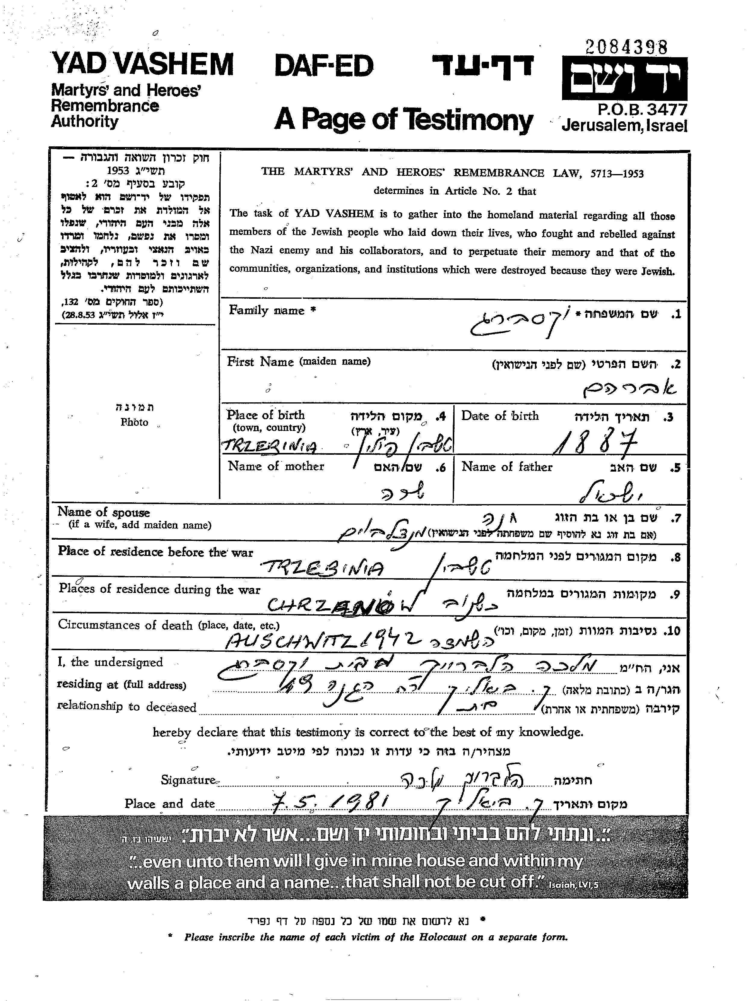 Abraham Wachsberg was born in Chrzanow, Poland, 1887. He was a shop owner. Prior to WWII he lived in Chrzanow, Poland. Abraham was murdered in the Shoah. Place of death: unknown, 1942.