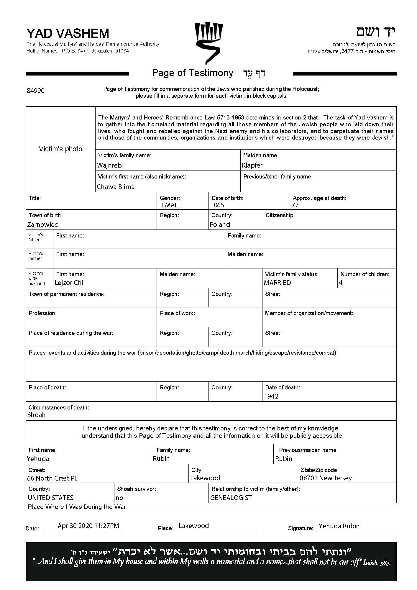 Chawa Blima Wajnreb nee Klapfer was born in Zarnowiec, Poland, 1865. She was married to Lejzor Chil. Prior to WWII she lived in מקום מגורים לבדיקה. Chawa Blima was murdered in the Shoah. Place of death: unknown, 1942.