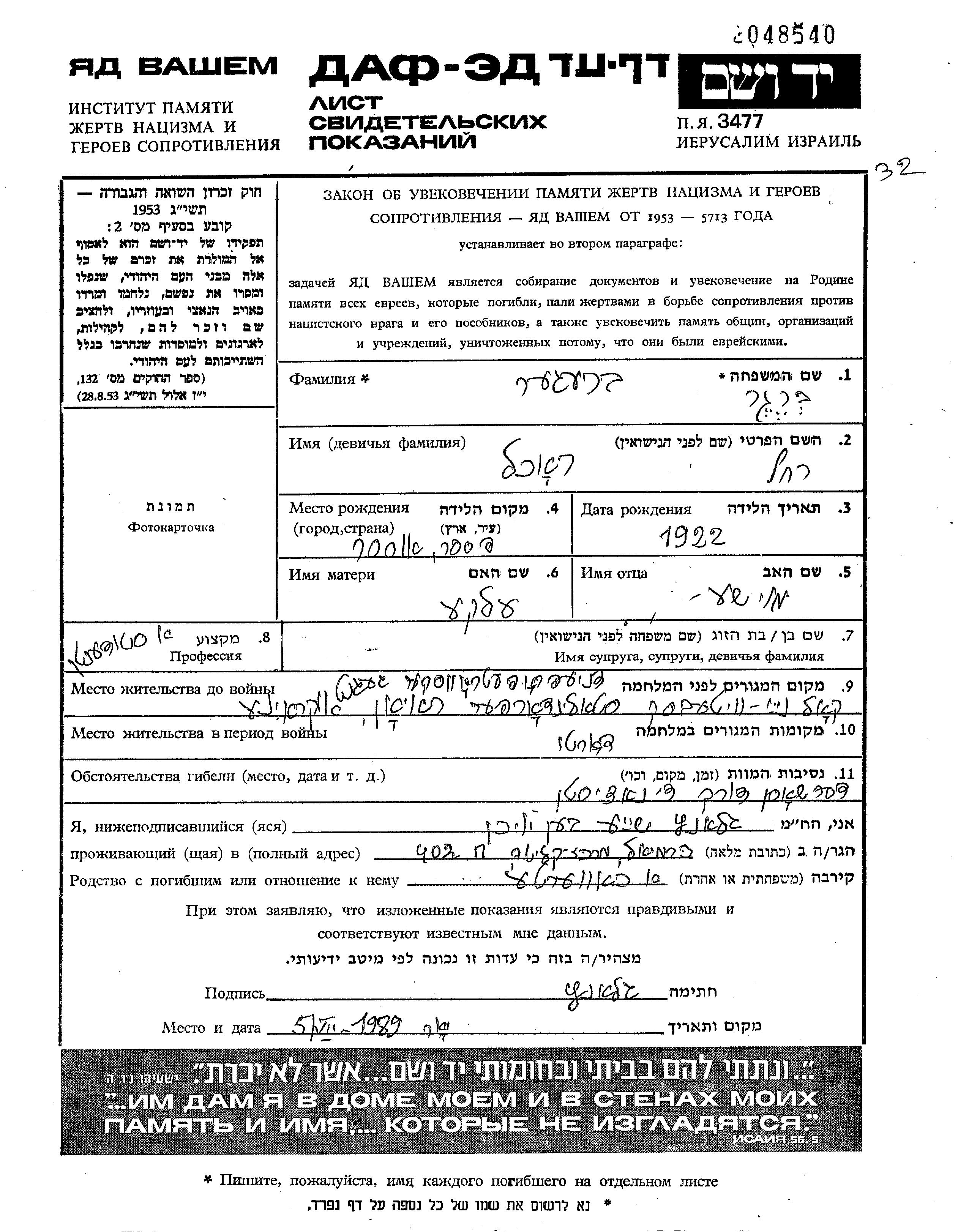 Rokhl was murdered in the Shoah. Place of death: Novo Vitebsk, Ukraine (USSR).