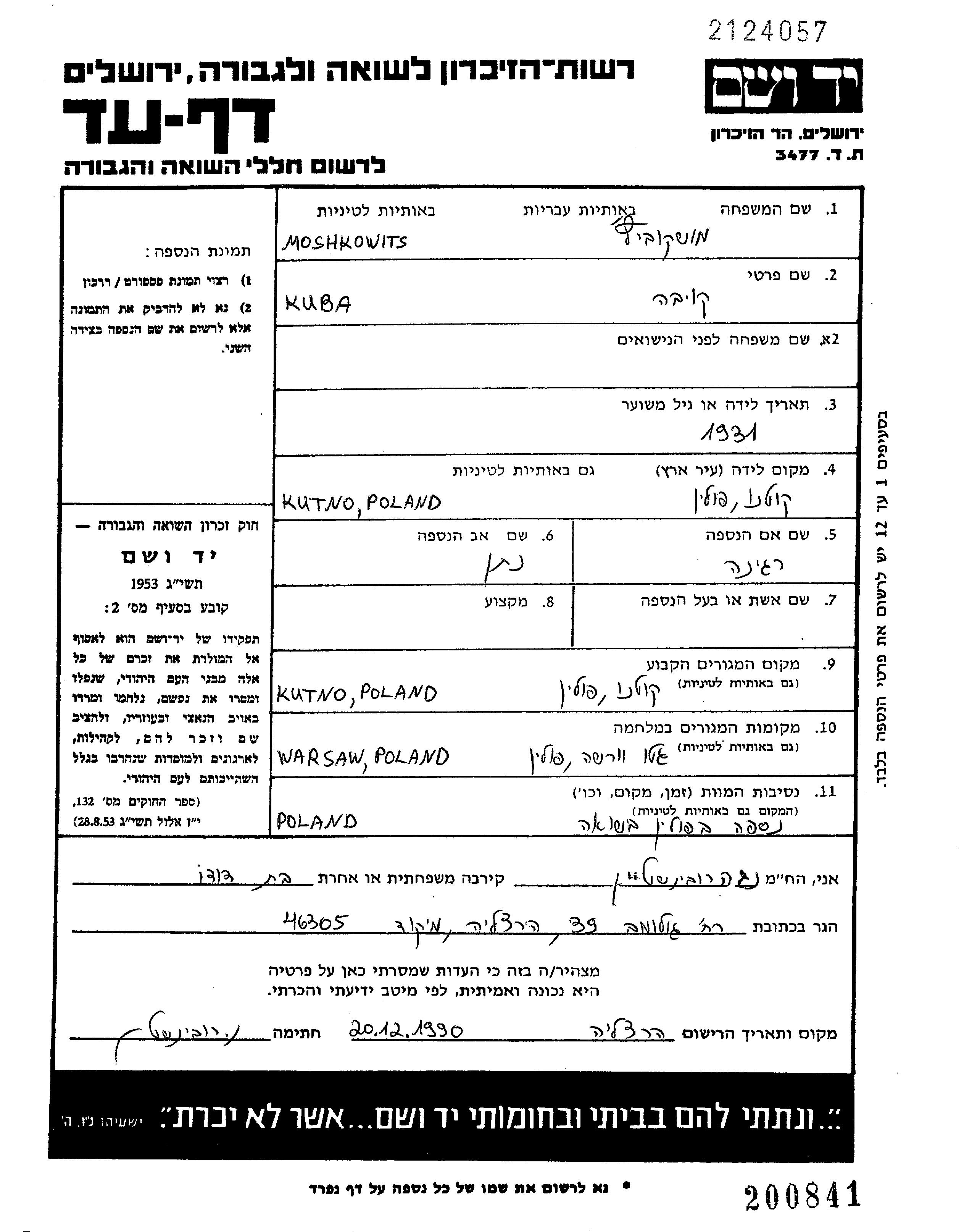 Moshkowits Kuba 1931 Kutno, Poland Page of Testimony