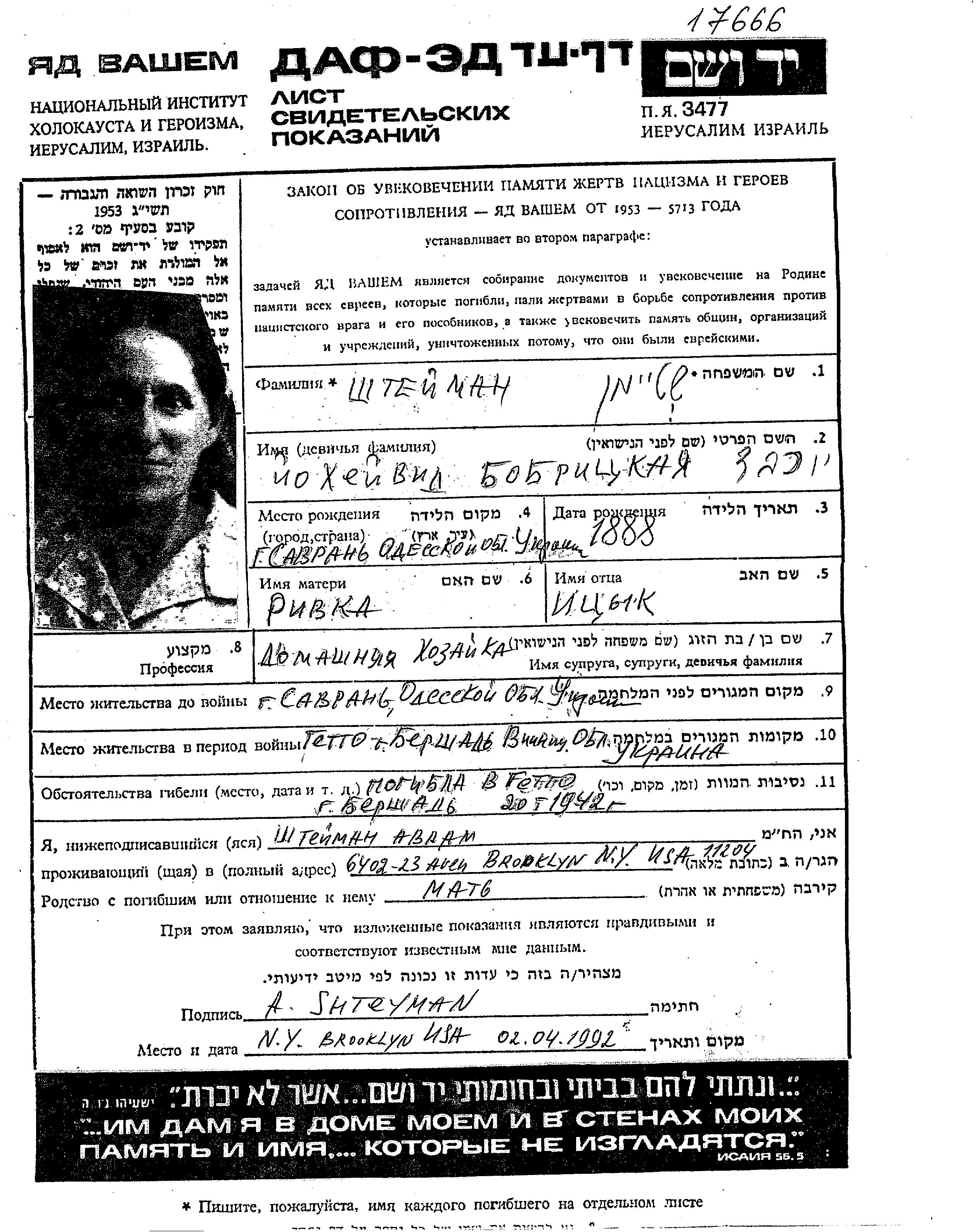 | Shteiman | Yokheved | 1888 | Savran, Ukraine (USSR) | Page of Testimony |