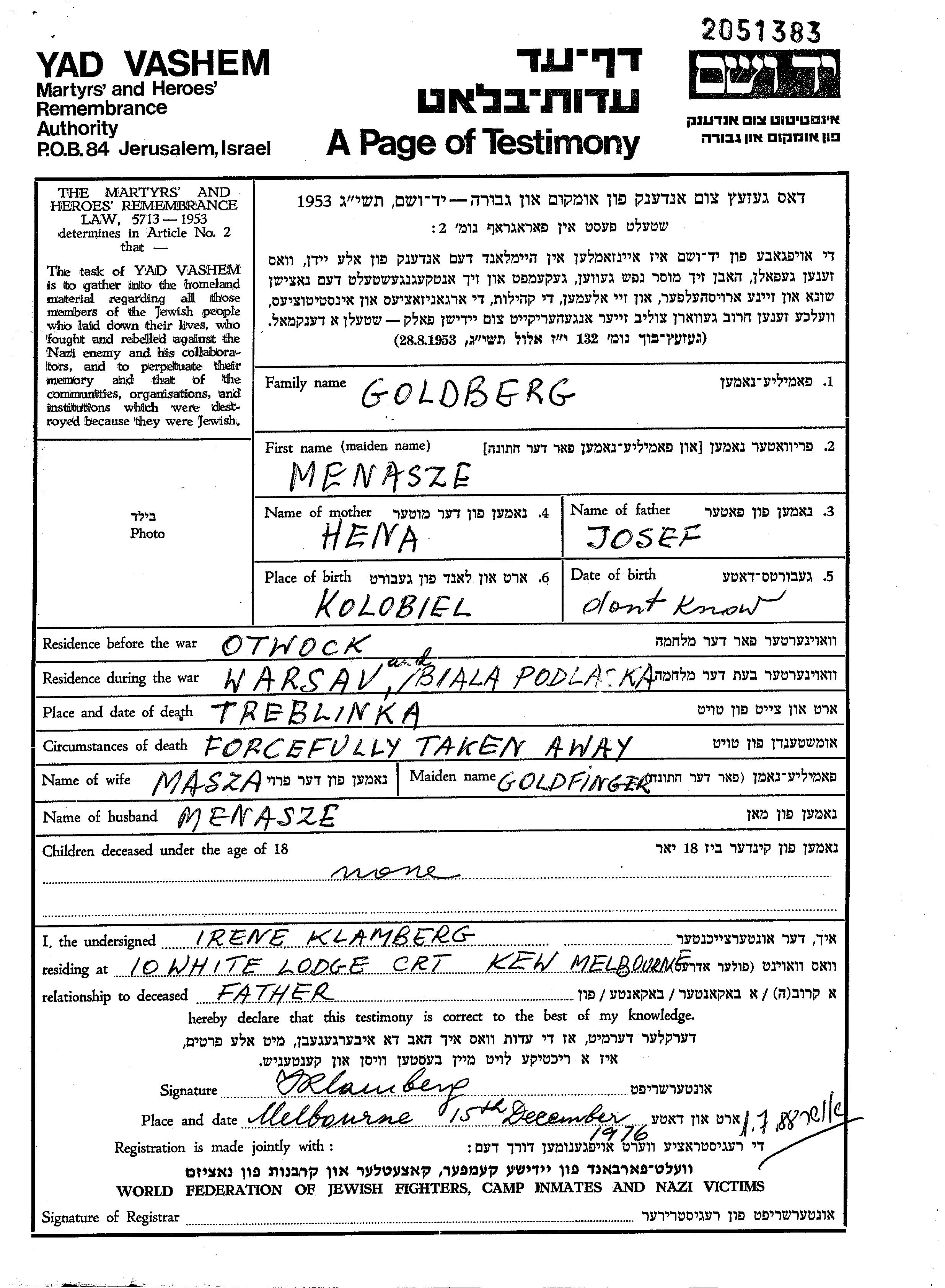 Goldberg Menasze Otwock, Poland Page of Testimony