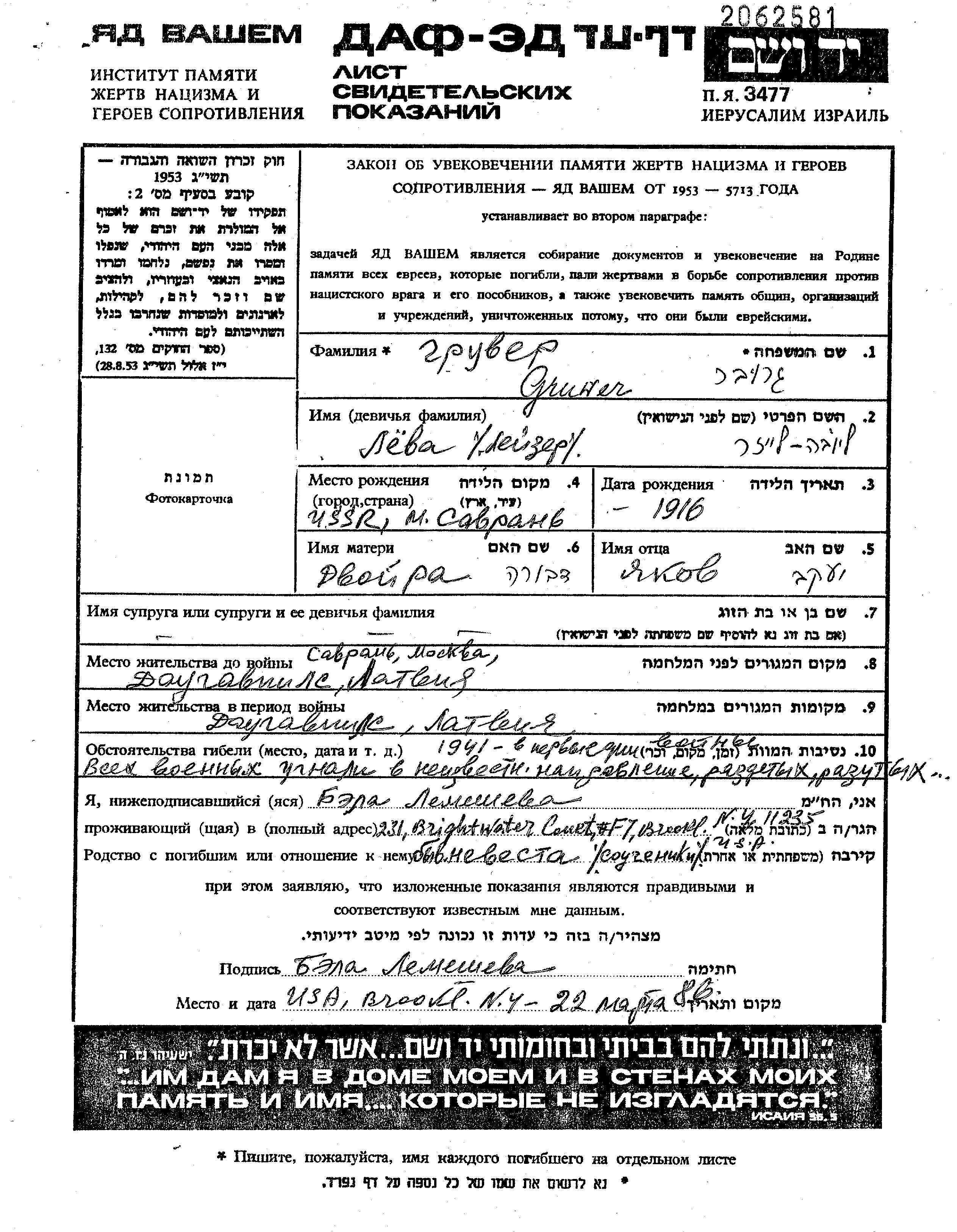 Gruver Lyova Leizer 1916 Daugavpils, Latvia Page of Testimony