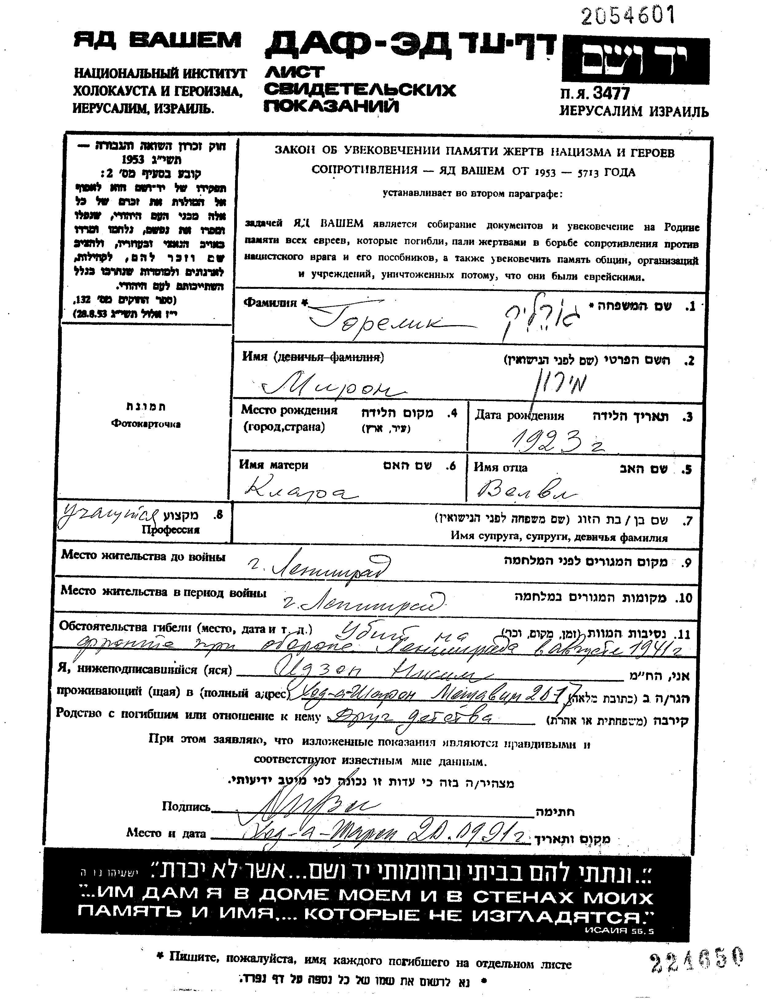Gorelik Miron Leningrad, Russia (USSR) Page of Testimony