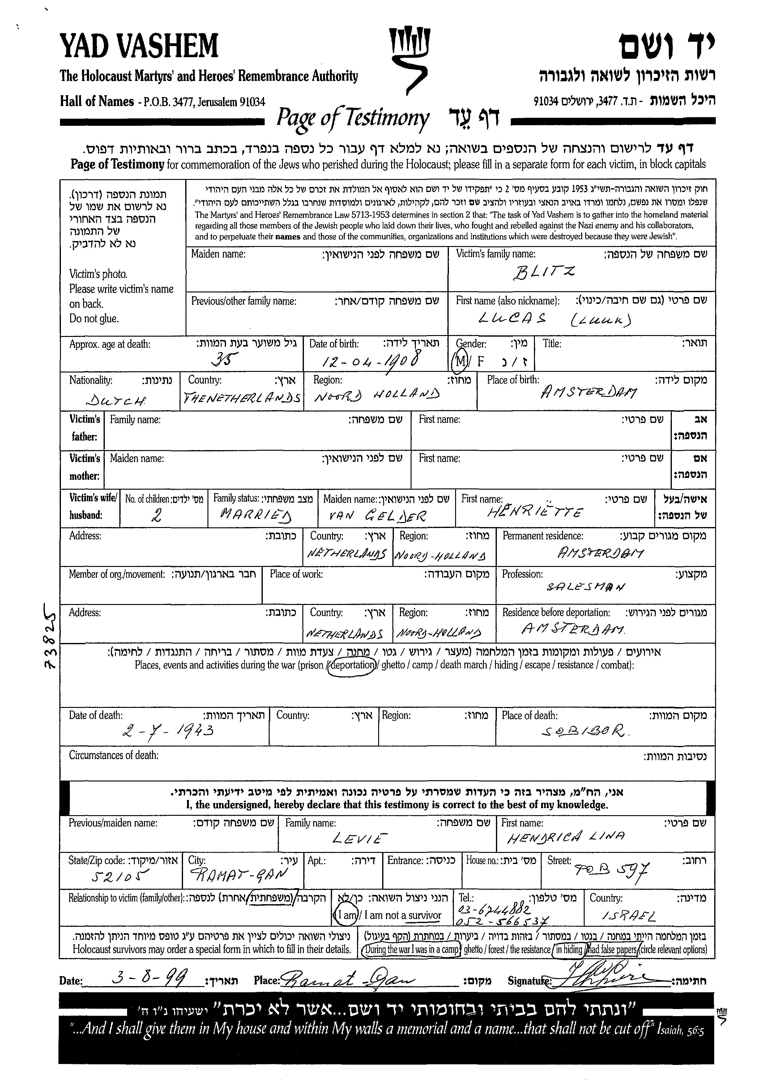 Lucas Blitz was born in Amsterdam, The Netherlands, 1908. He was a salesman. Prior to WWII he lived in Amsterdam, The Netherlands. Lucas was murdered in the Shoah. Place of death: Sobibor, Poland, 02/07/1943.