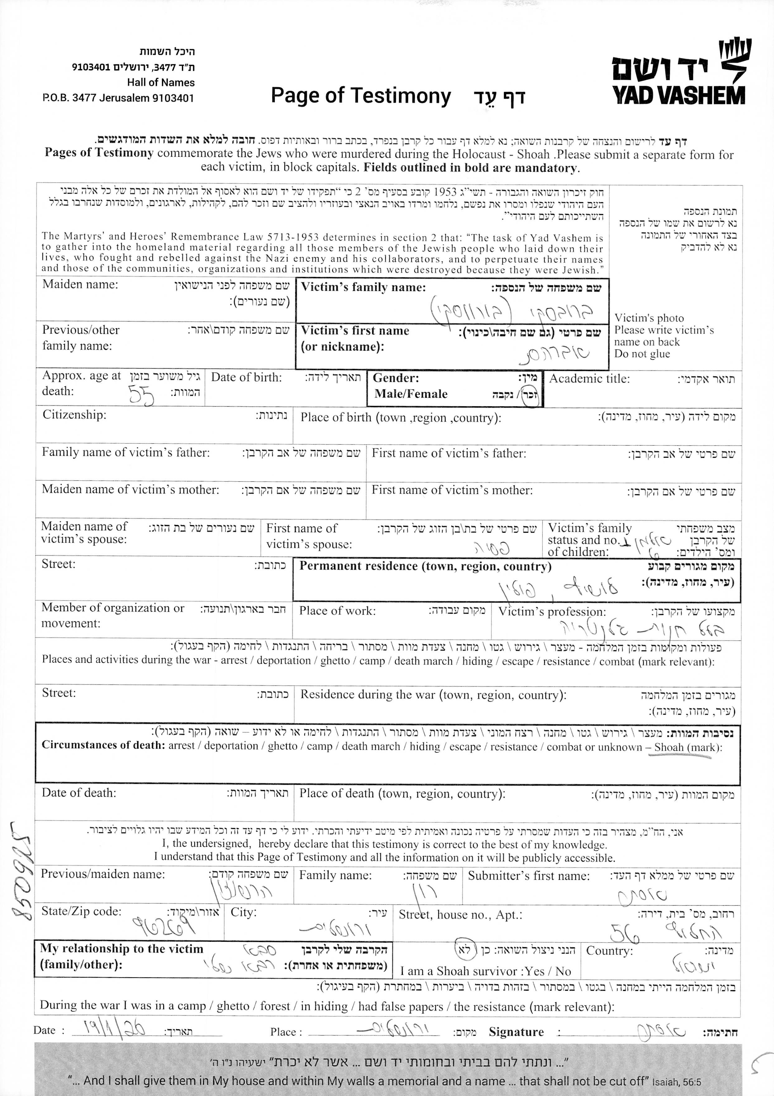 Yad Vashem - Pages of Testimony Names Memorial Collection