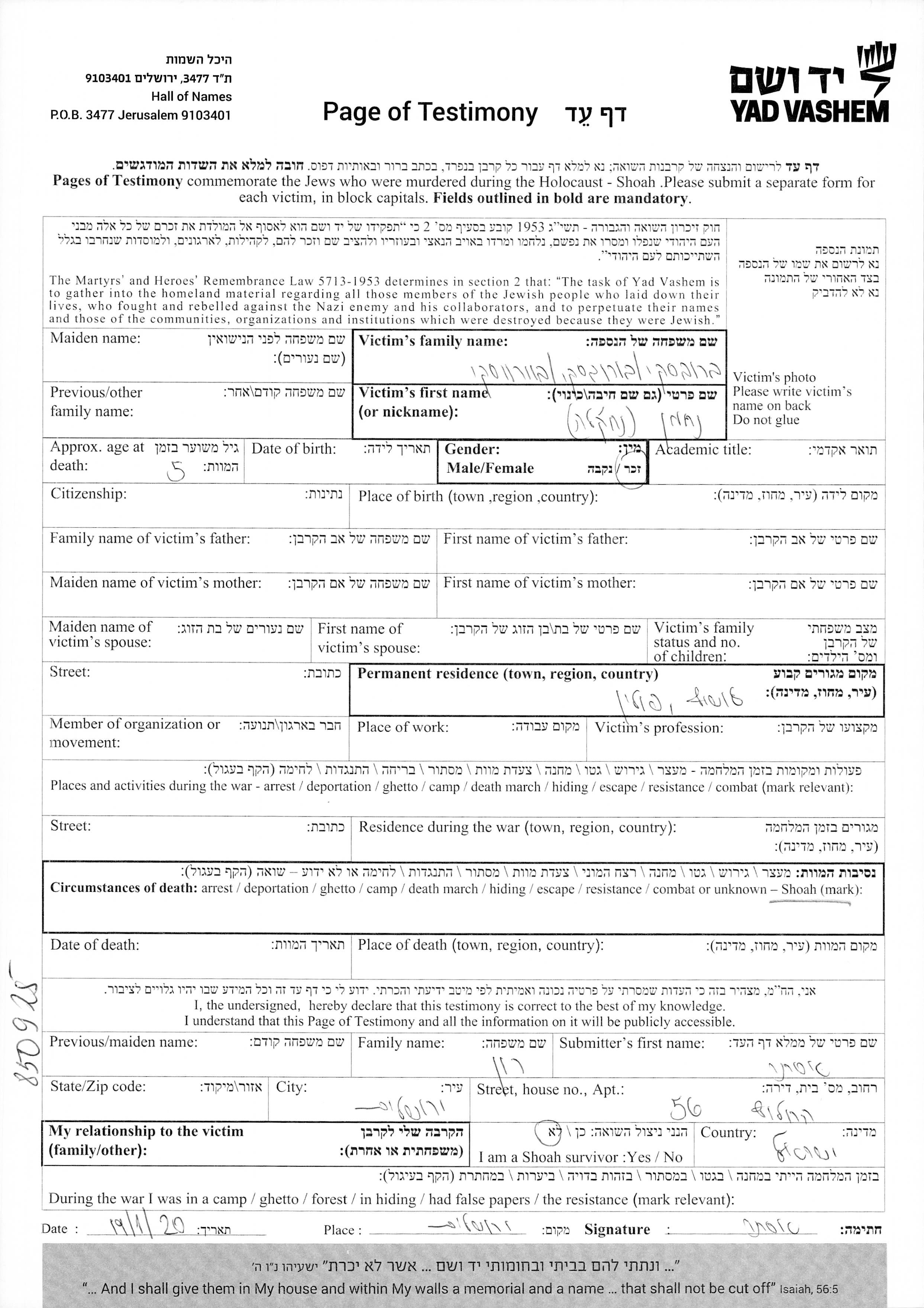 Yad Vashem - Pages of Testimony Names Memorial Collection
