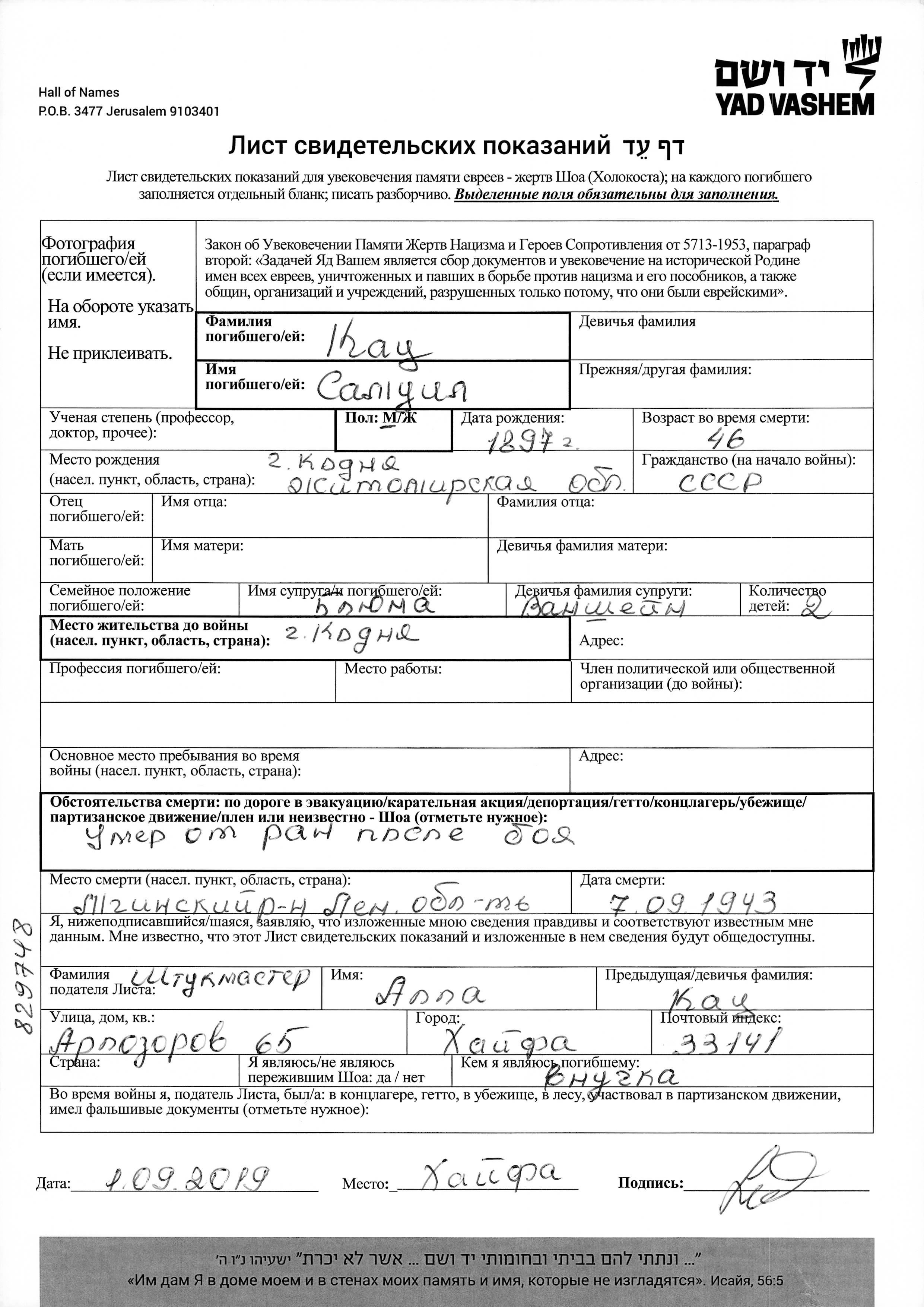 Samuil Katz was born in Kodnya, Ukraine (USSR), 1897. He was married to Blyuma nee Vansheyn. Prior to WWII he lived in Kodnya, Ukraine (USSR). During the war he was in the Soviet armed forces. Samuil was killed in military service in WWII. Place of death: Mga, Russia (USSR), 07/09/1943.