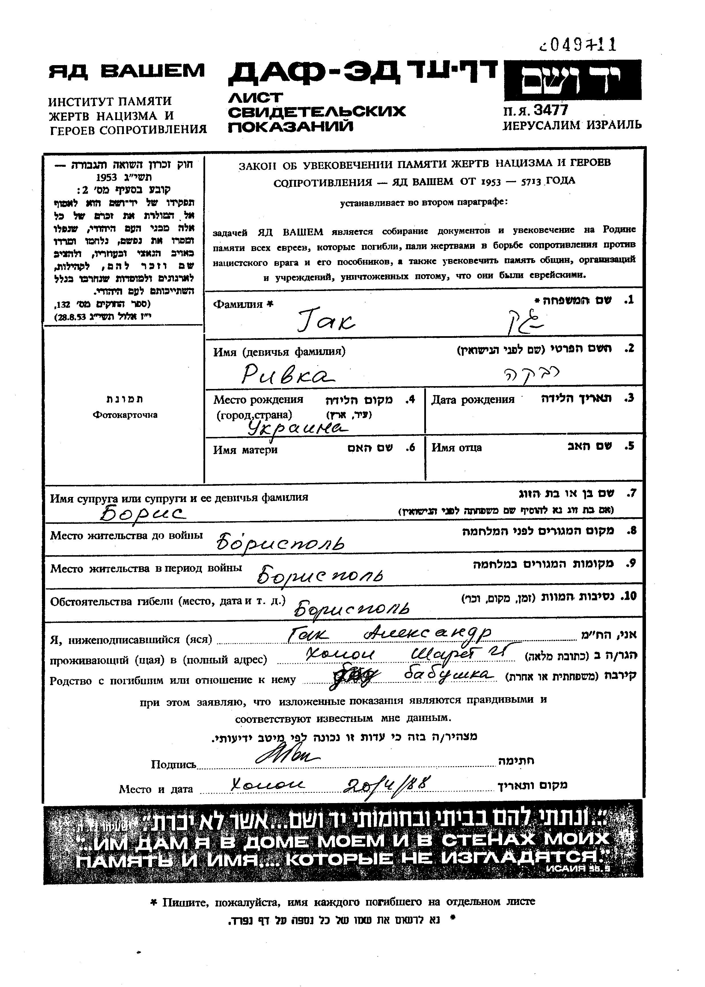 Gak Rivka Borispol, Ukraine (USSR) Page of Testimony