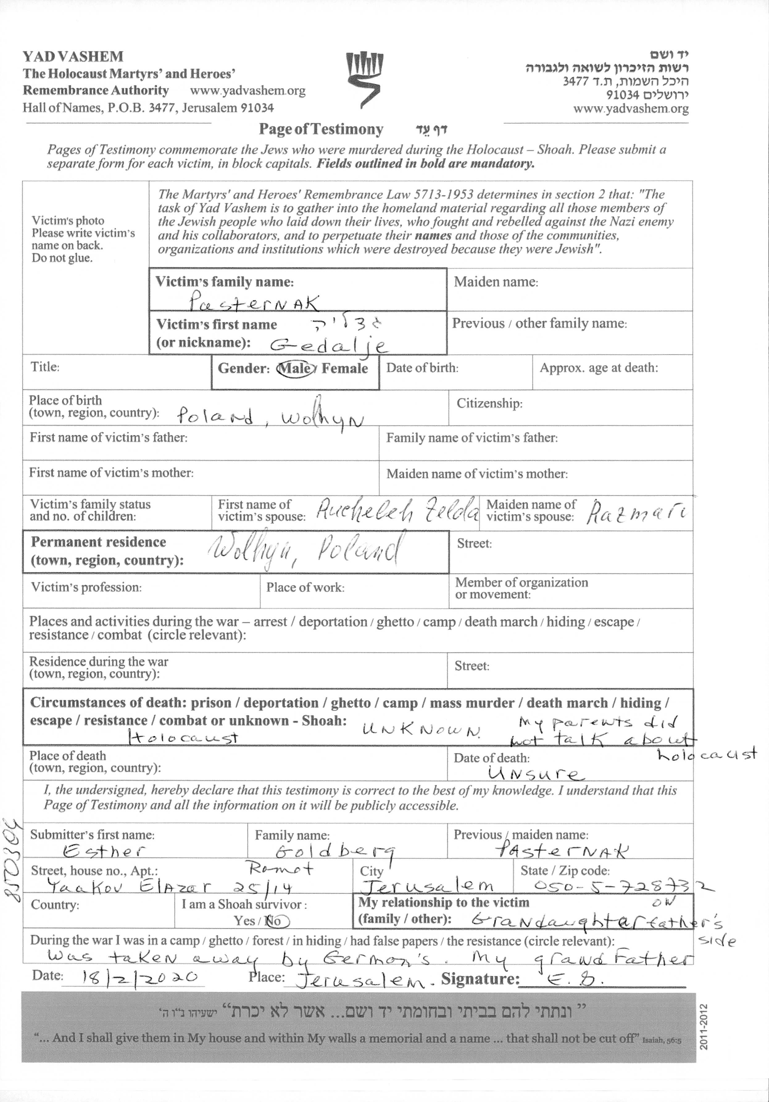 Pasternak Gedalje Poland Page of Testimony