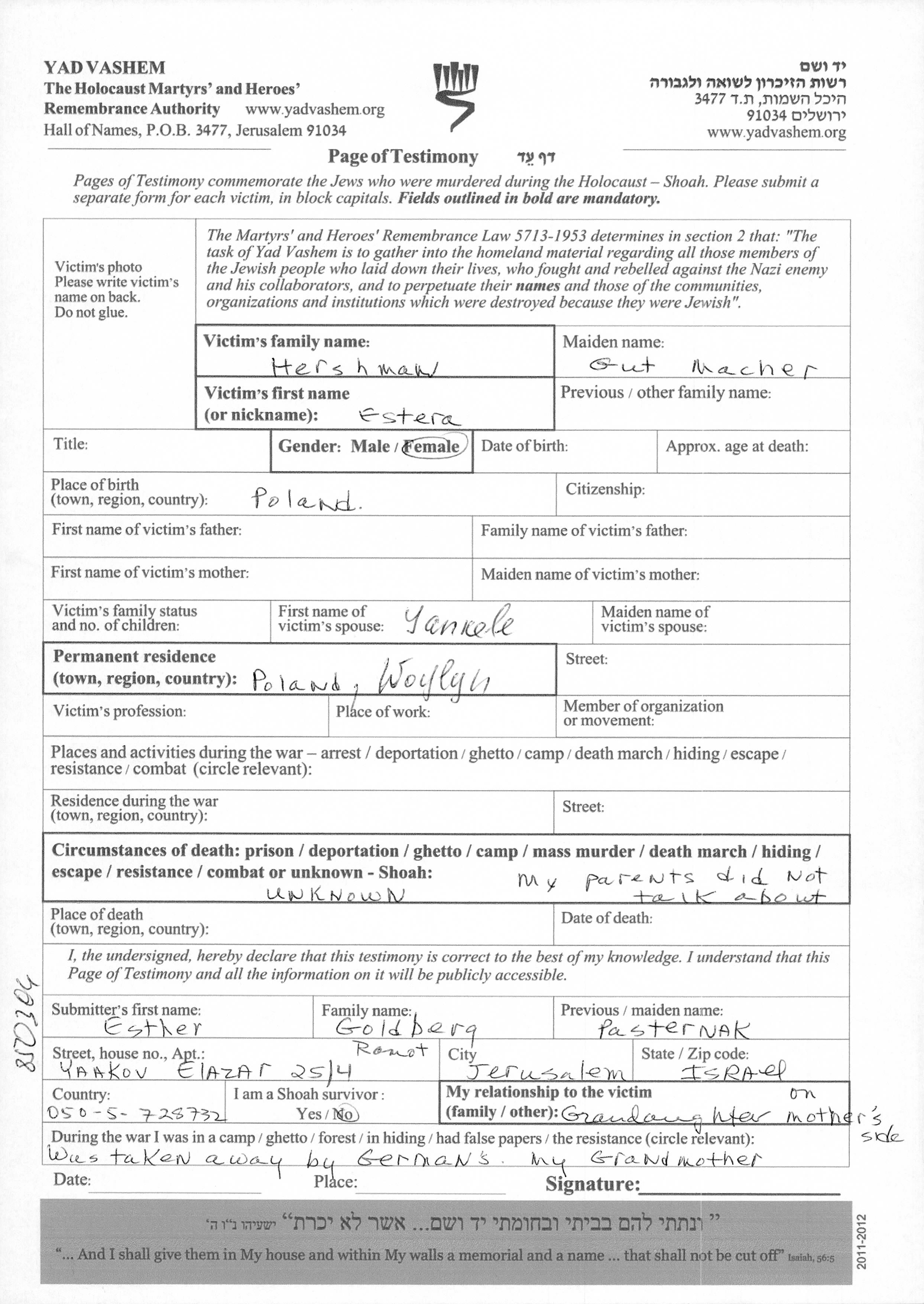 Estera Hershman nee Gutmacher was born in Poland. She was married to Yankele. Prior to WWII she lived in Wolyn, Poland.