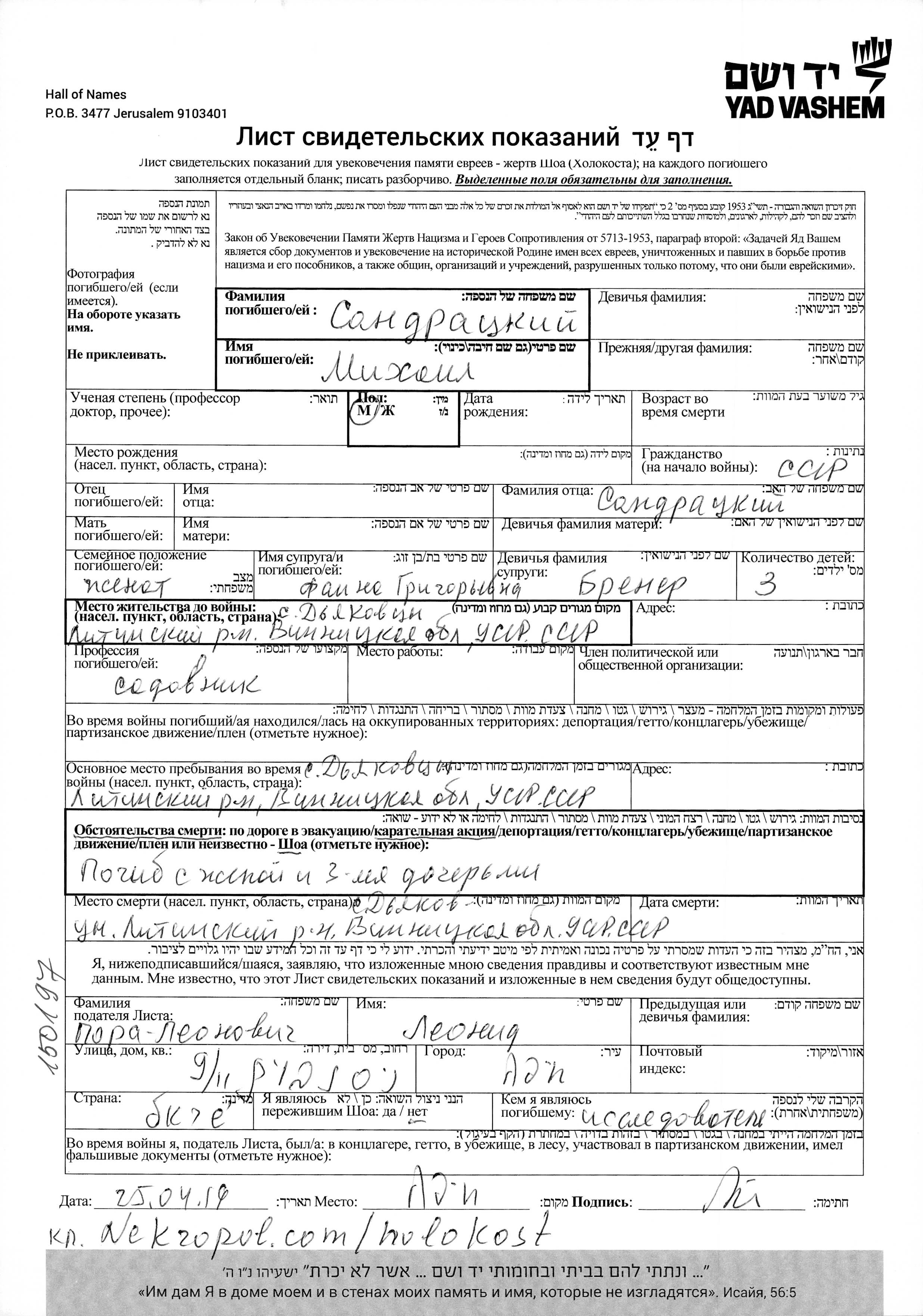 Mikhail Sandratzkiy. He was a sadovnik and married to Fayina nee Brener. Prior to WWII he lived in Dyakovtsy, Ukraine (USSR). During the war he was in Dyakovtsy, Ukraine (USSR). Mikhail was murdered in the Shoah. Place of death: Dyakovtsy, Ukraine (USSR).