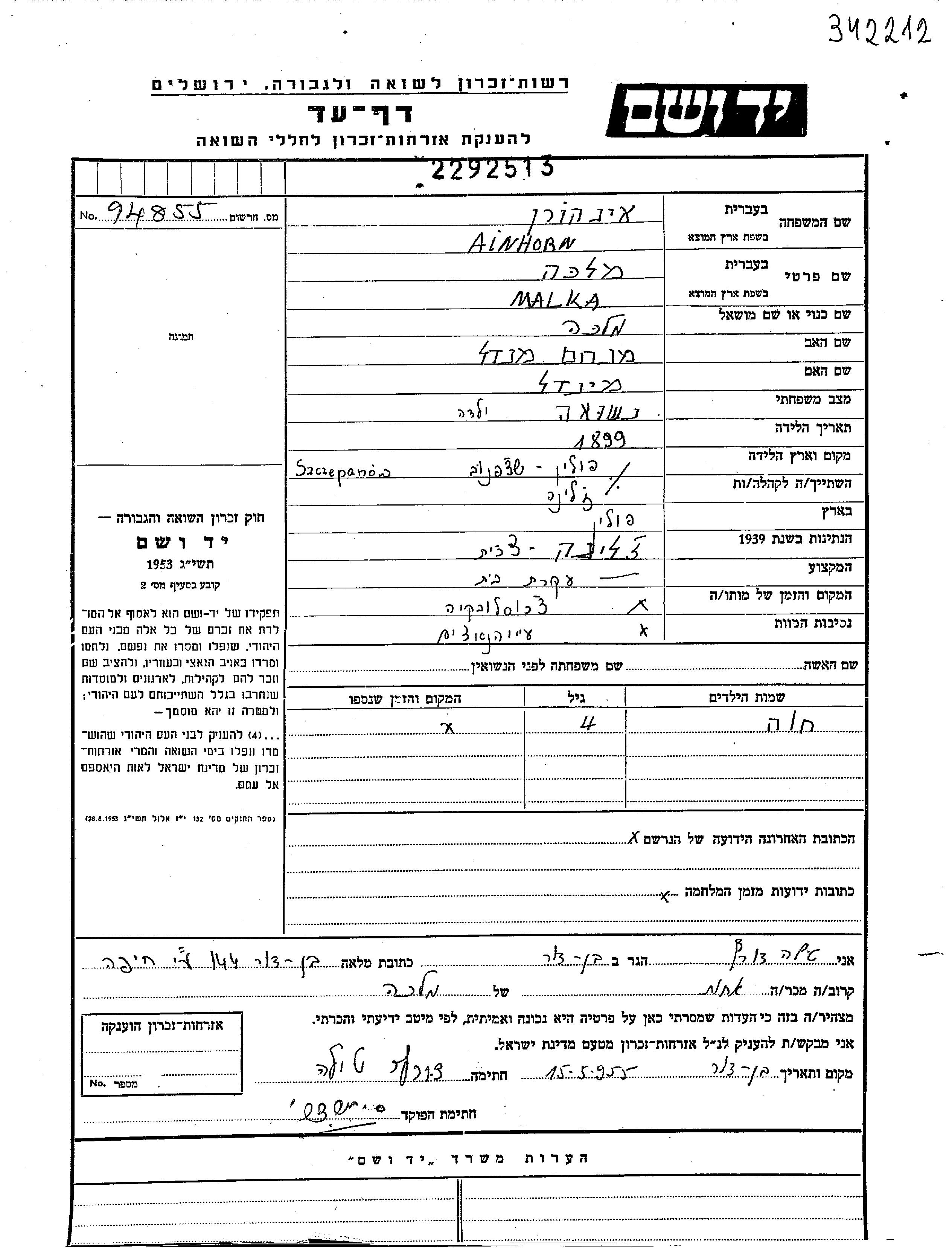 | Ainhorn | Malka | 1899 | Zilina, Czechoslovakia | Page of Testimony |