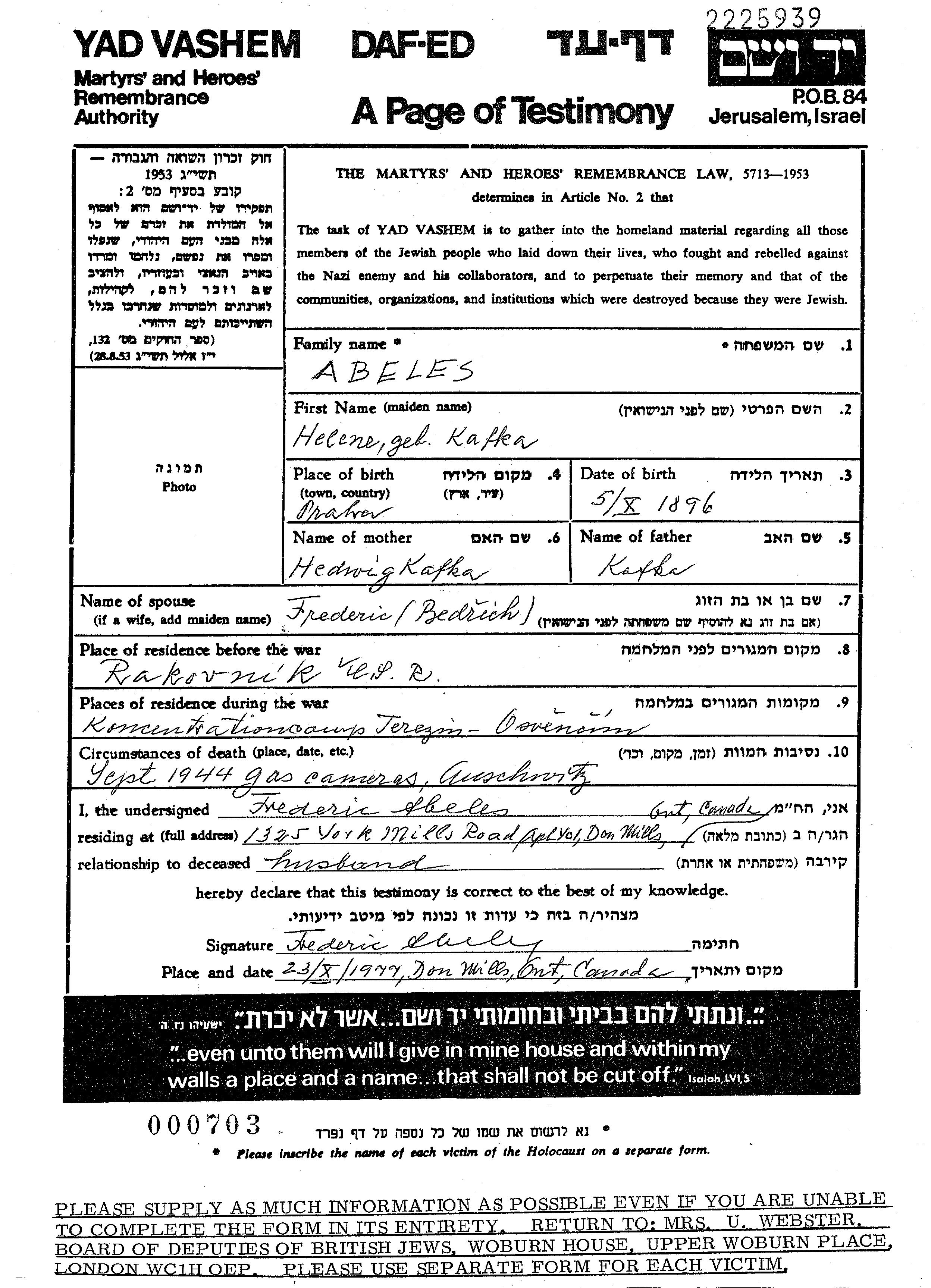 Abeles | Helene | 1896 | Rakovnik, Czechoslovakia | Page of Testimony |