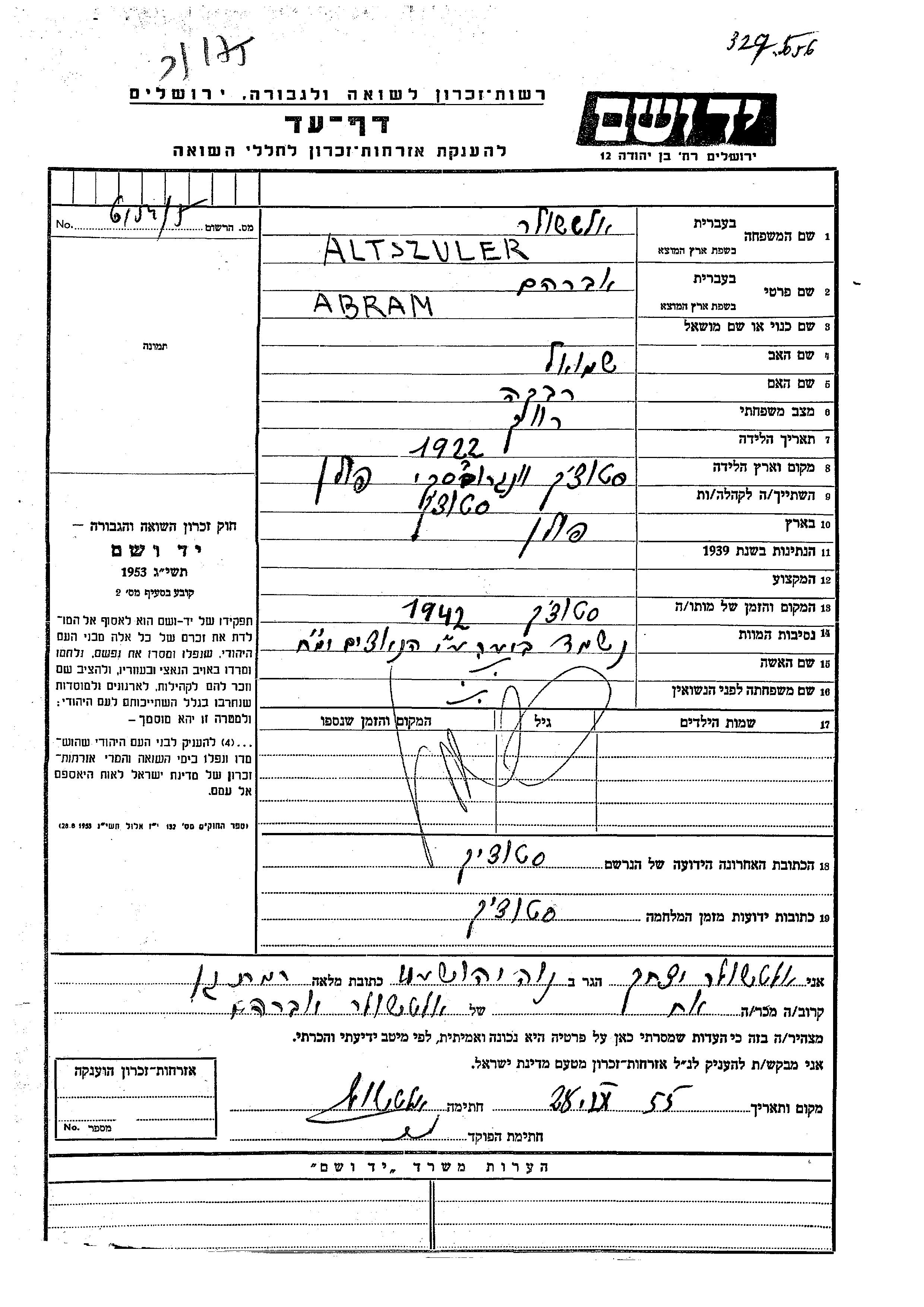 | Altschuler | Avraham | 1922 | Stoczek, Poland | Page of Testimony |