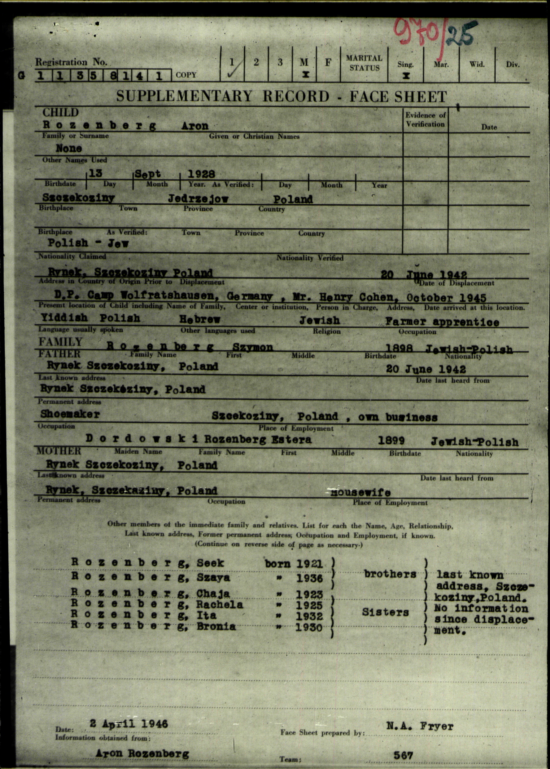 Szymon Noje Rozenberg was born in Kielce, Poland, 1897. He was a shoemaker. Prior to WWII he lived in Szczekociny, Poland.