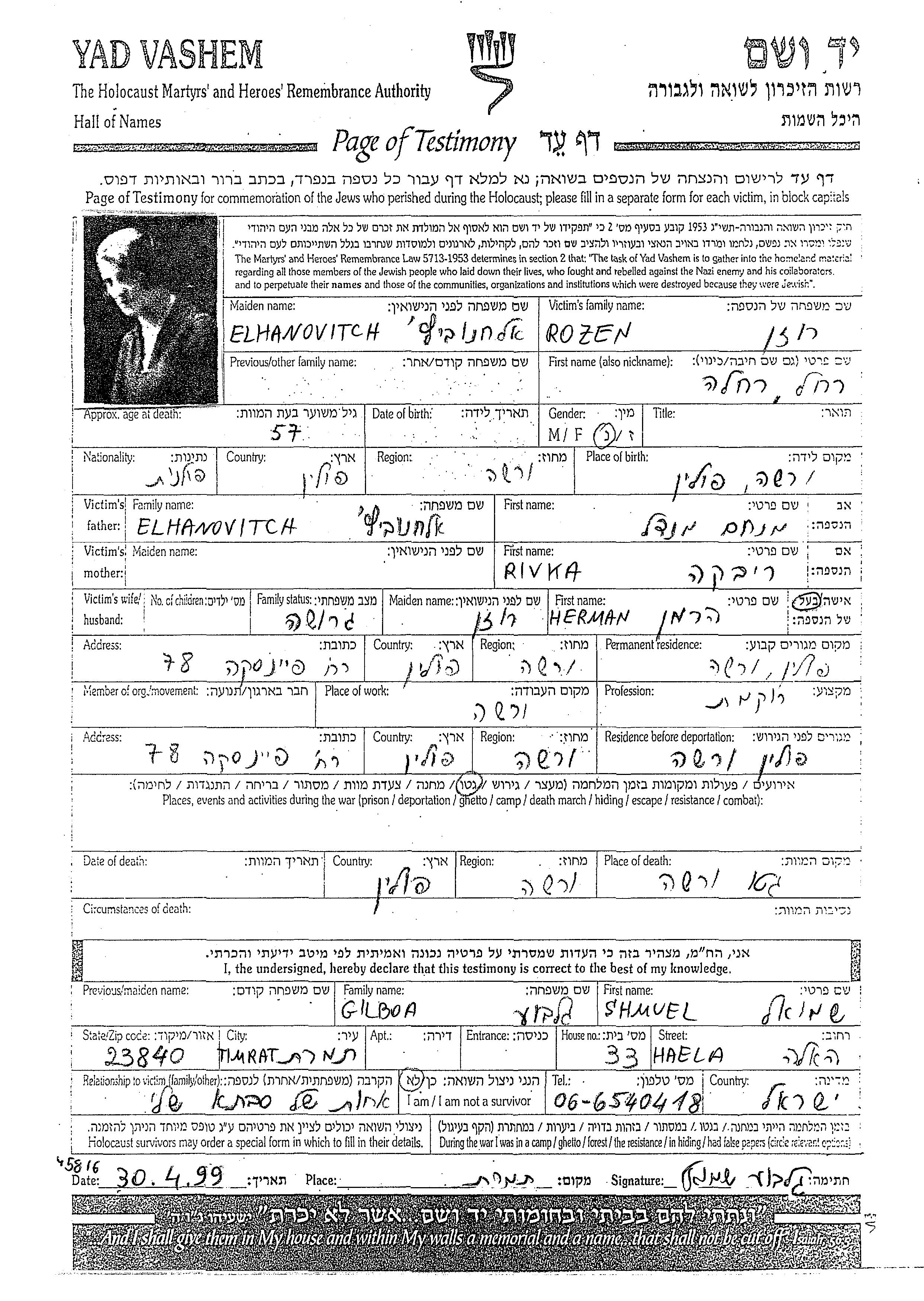 Rozen Rakhel Warszawa, Poland Page of Testimony