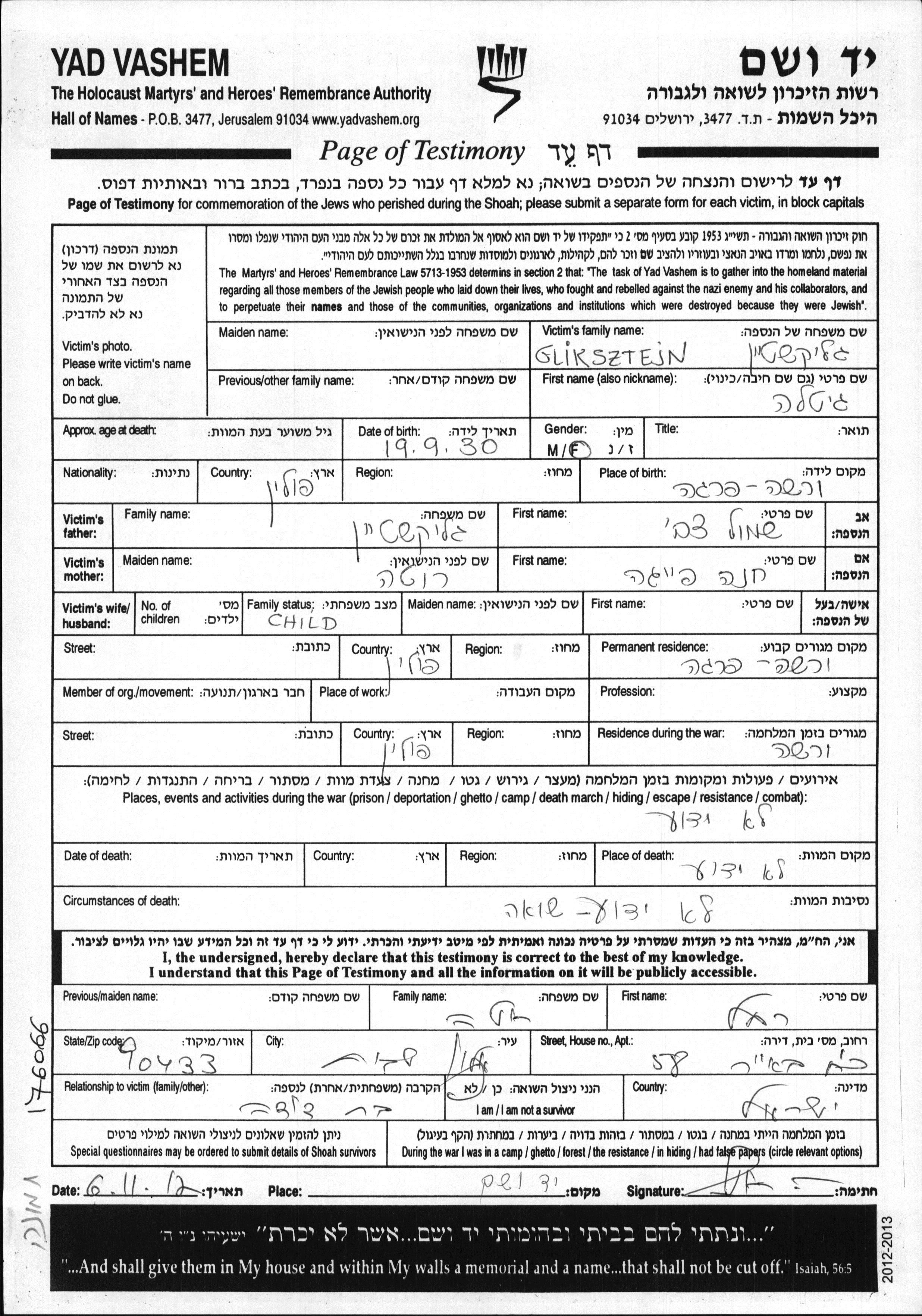 | Gliksztejn | Gitla | 1930 | Praga Warszawa, Poland | Page of Testimony |