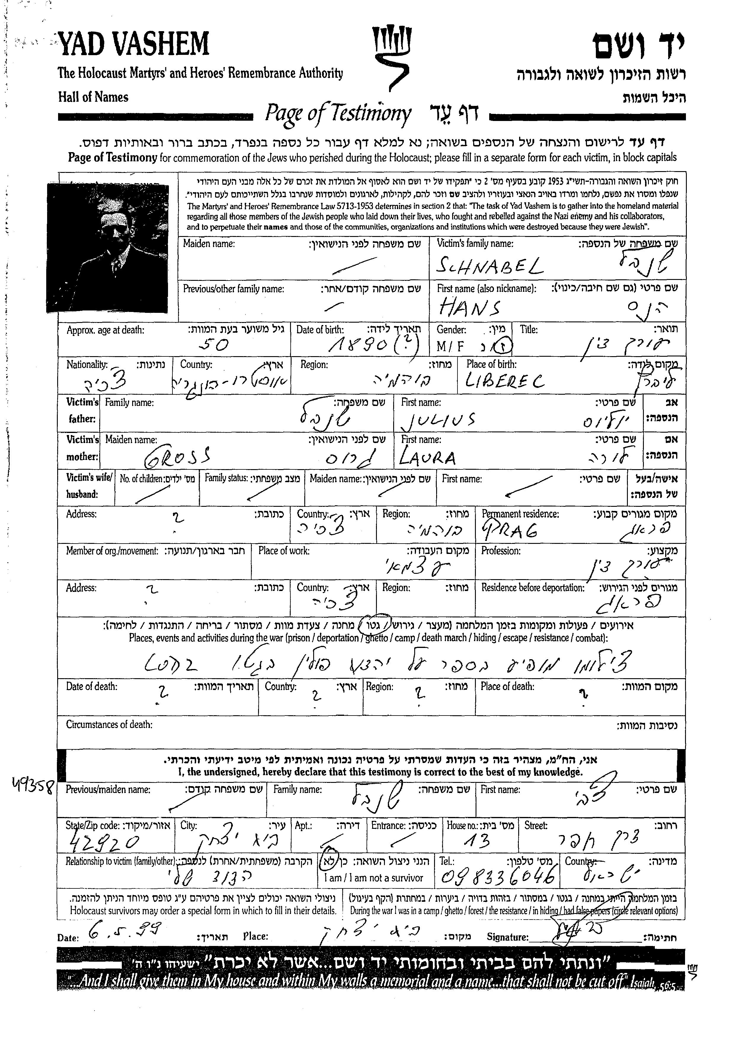 Schnabel Hans 1890 Prague, Czechoslovakia Page of Testimony