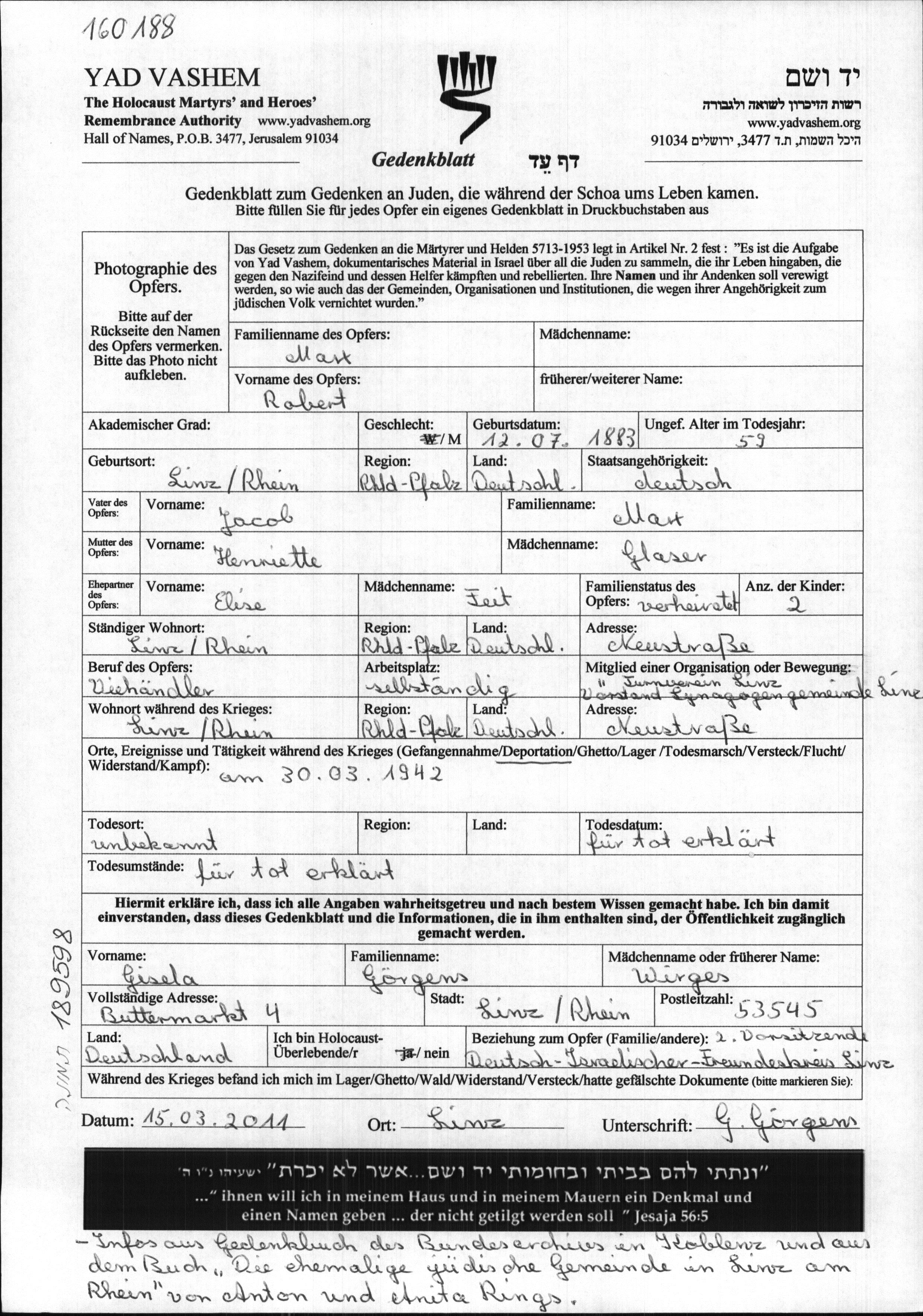 Marx Robert 1883 Linz am Rhein, Germany Page of Testimony