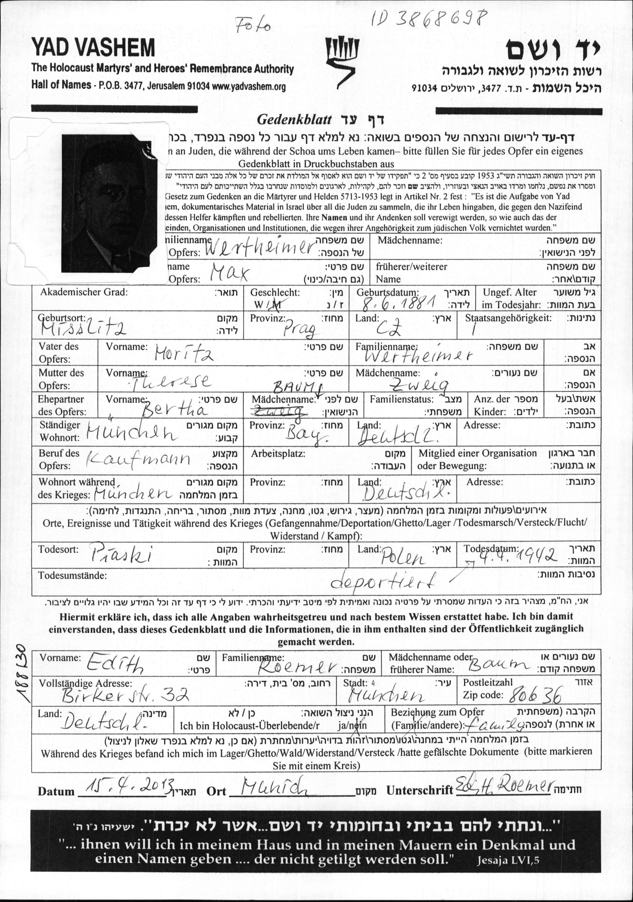 Max was murdered in the Shoah. Place of death: Piaski, Poland, 04/04/1942.