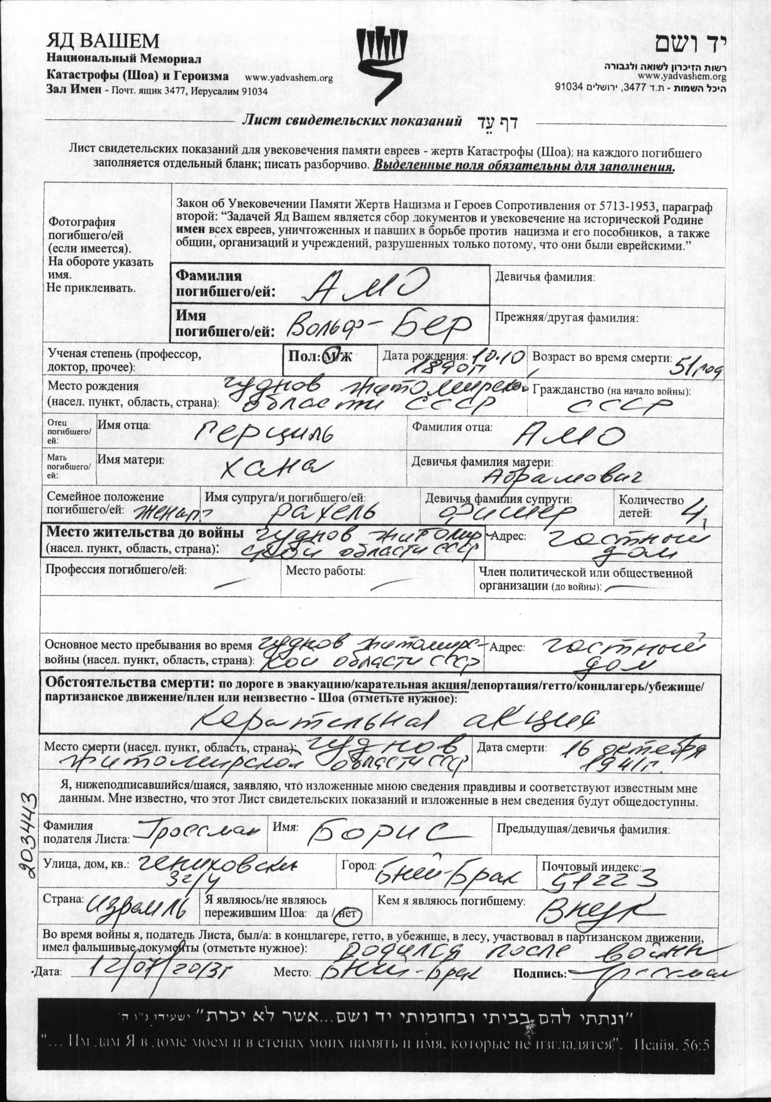 Volf Ber Amo was born in Chudnov, Ukraine (USSR), 1890. Prior to WWII he lived in Chudnov, Ukraine (USSR). Volf Ber was murdered in the Shoah. Place of death: Chudnov, Ukraine (USSR), 16/10/1941.
