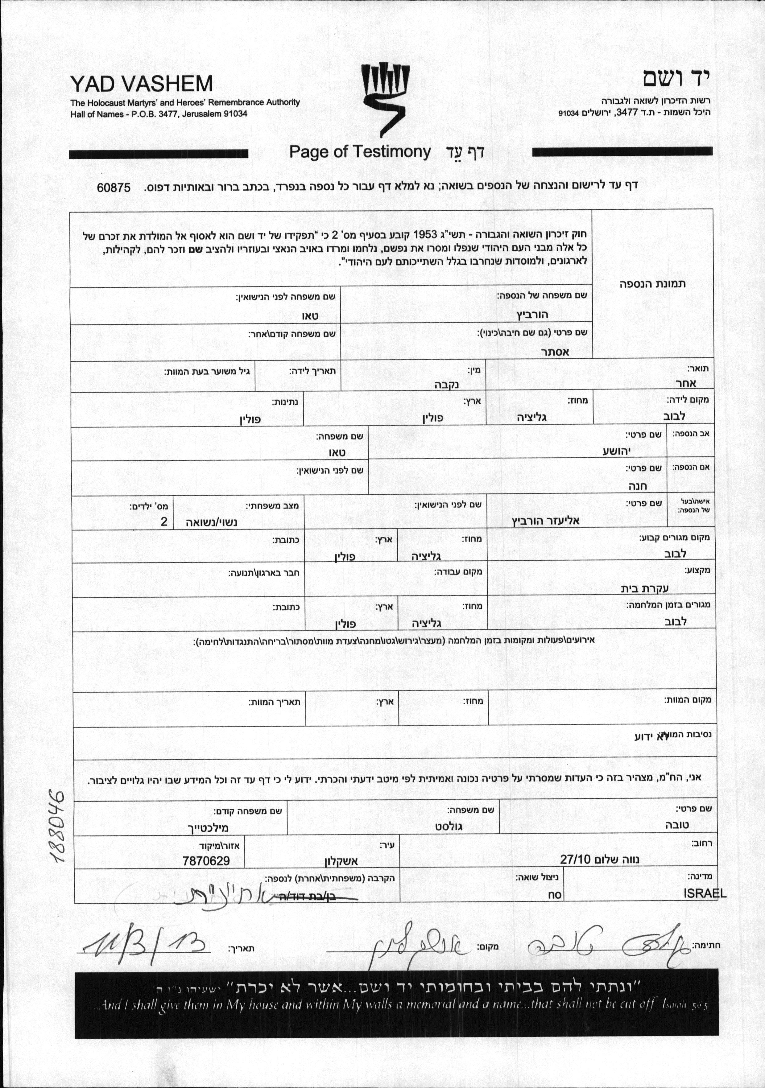 Hurevich Ester Lwow, Poland Page of Testimony (digital signed)