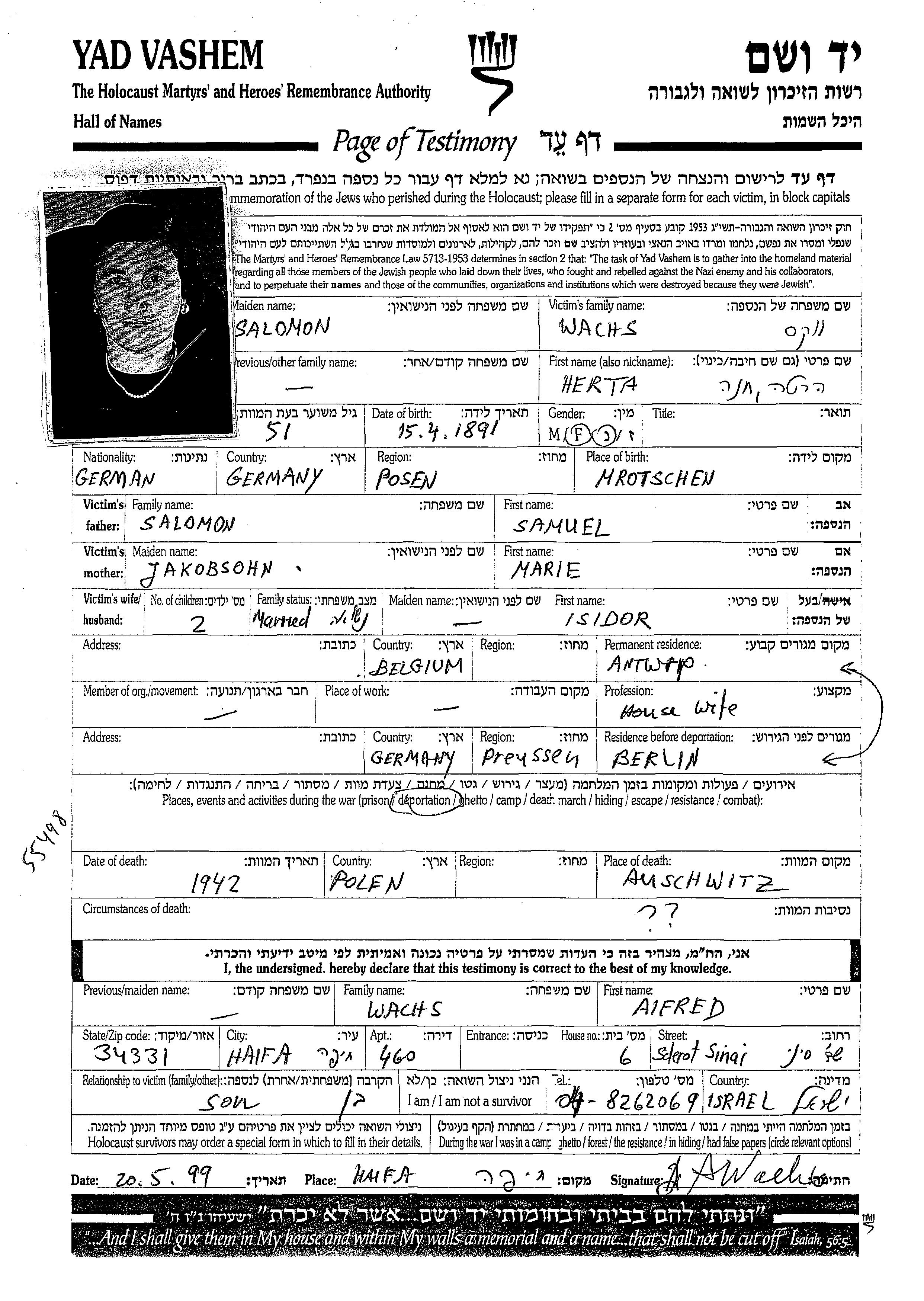 | Wachs | Rita Khana Herta | 1891 | Berlin, Germany | Page of Testimony |