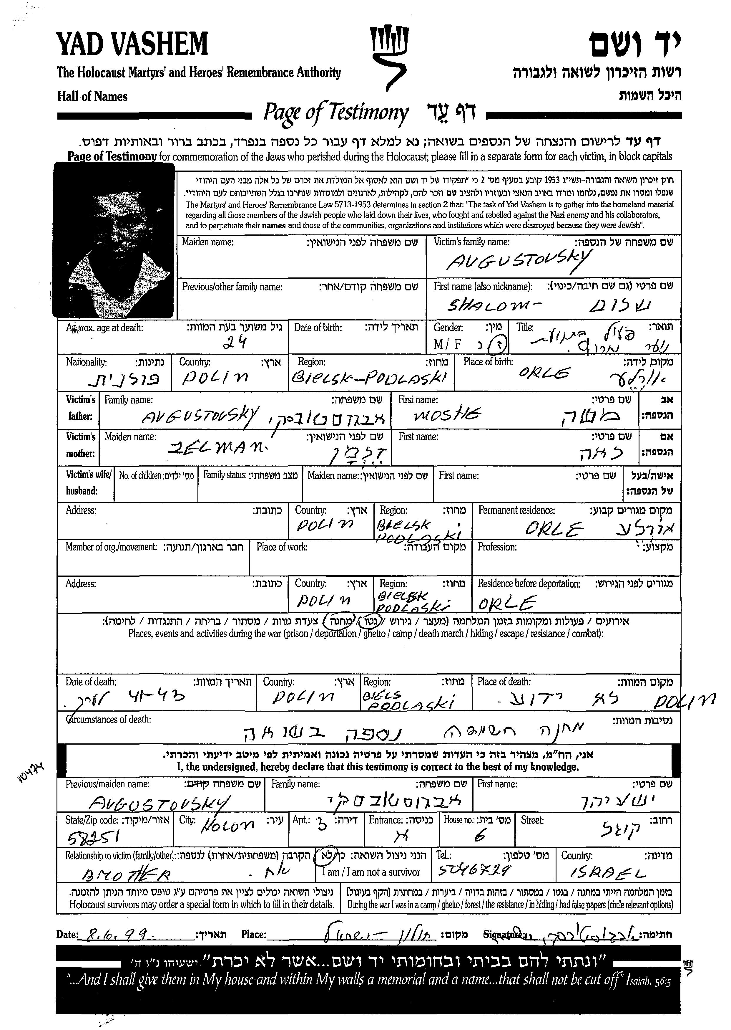 Augustovsky Shalom Orle, Poland Page of Testimony