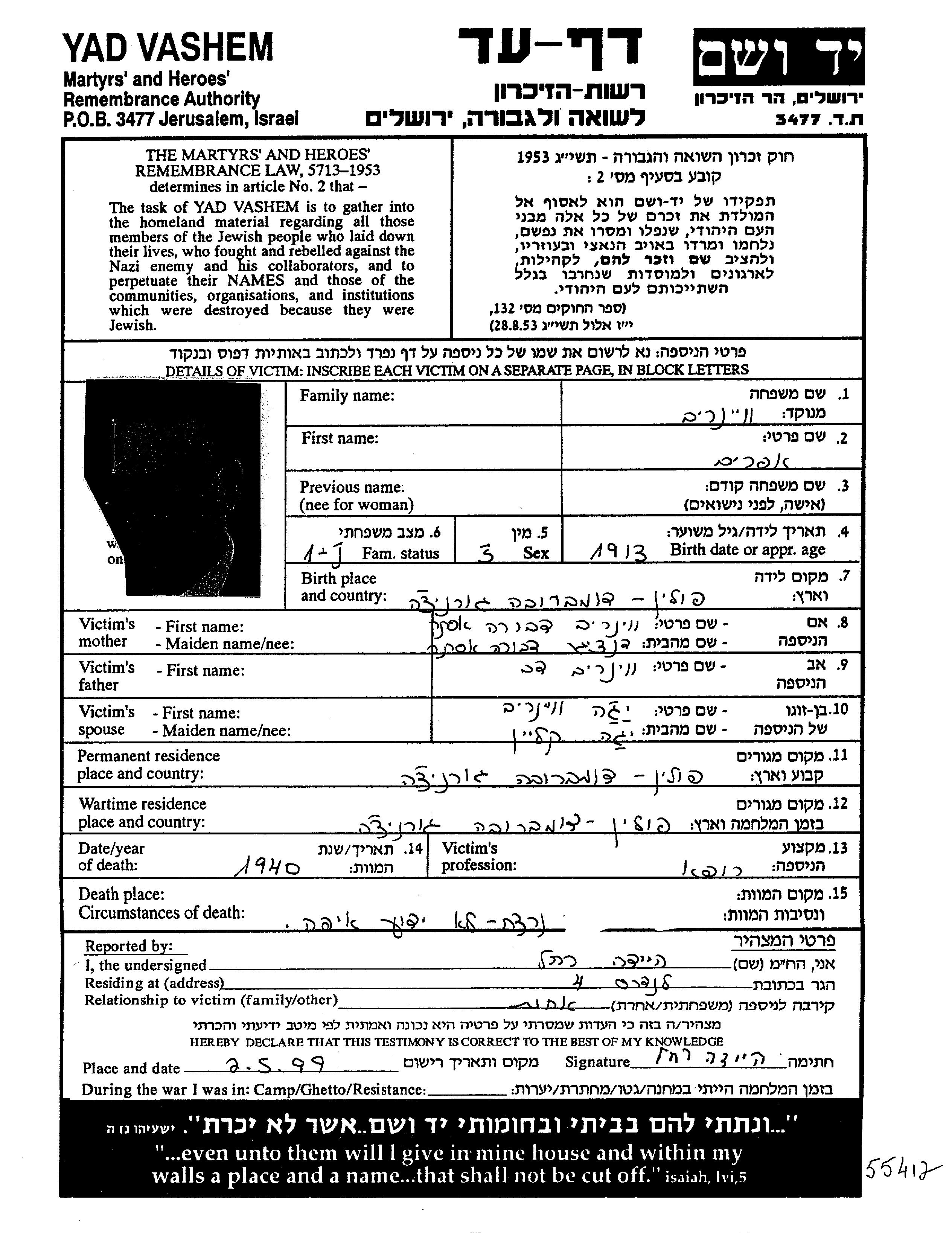 Veinrib | Efraim | 1913 | Dabrowa Gornicza, Poland | Page of Testimony |