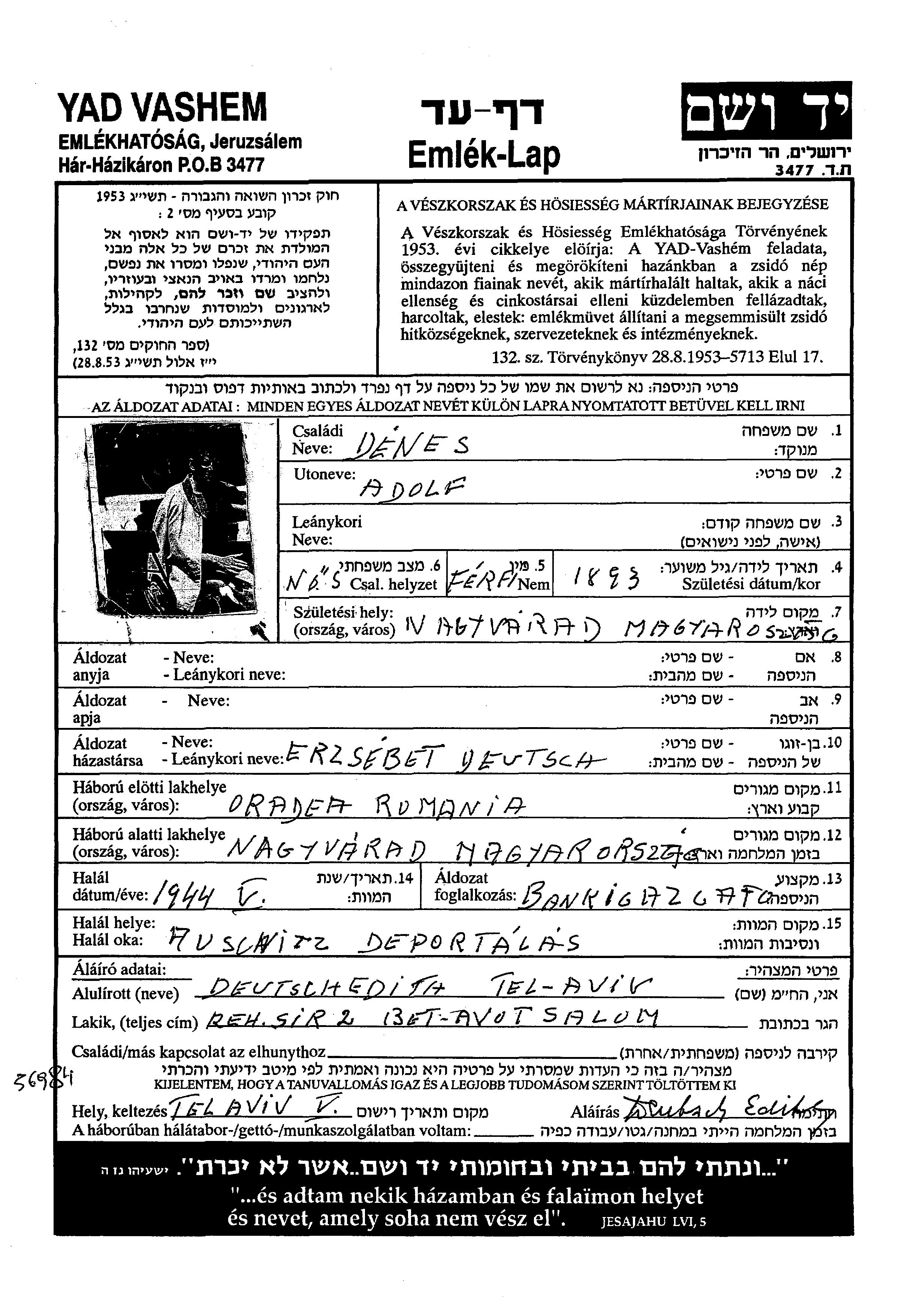 Adolf Denes was born in Oradea, Romania, 1893. He was a bankigazgato. Prior to WWII he lived in Oradea, Romania.