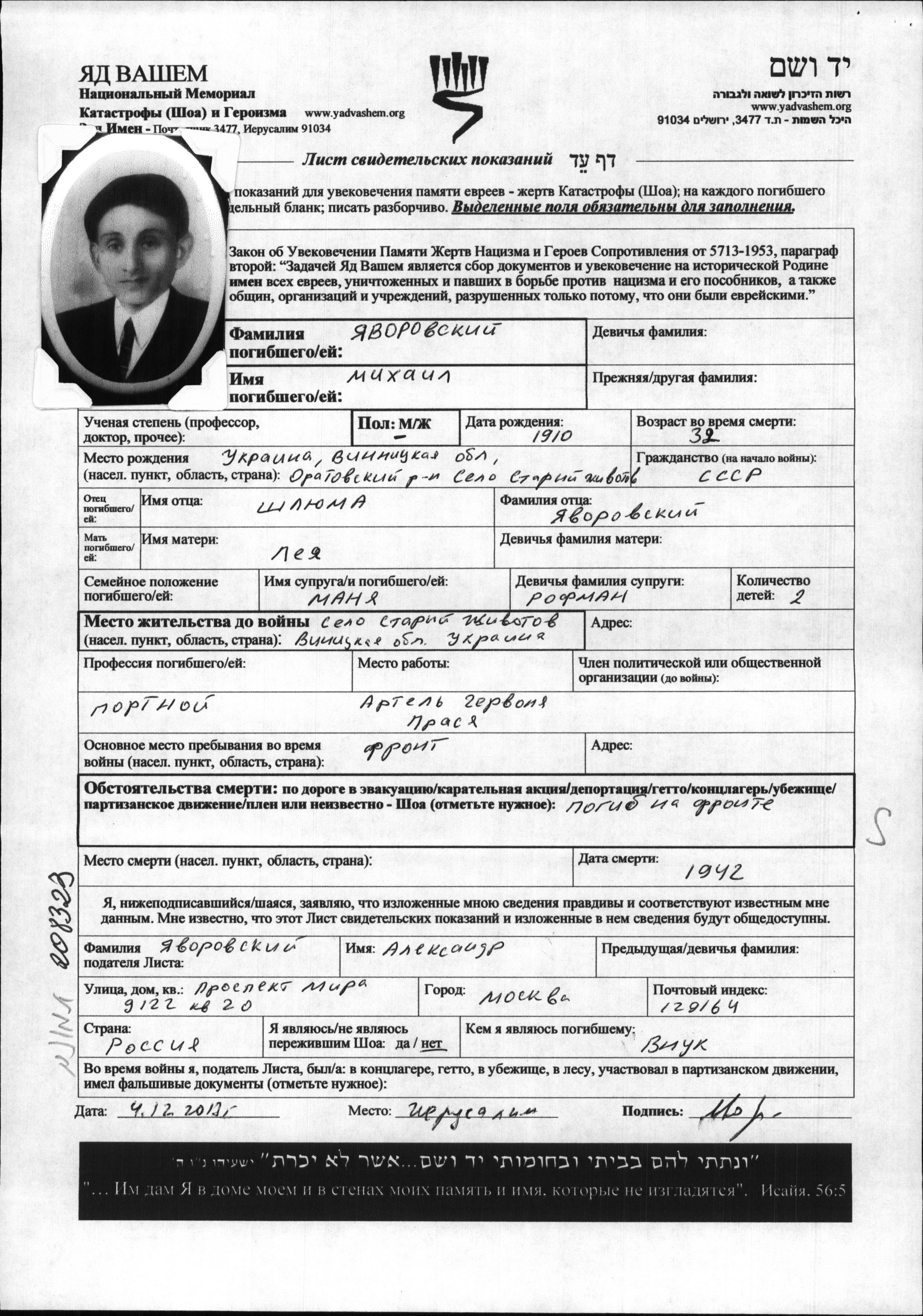 Mikhail Yavorovski was born in Stary Zhivotov, Ukraine (USSR), 1910. He was a taylor. Prior to WWII he lived in Stary Zhivotov, Ukraine (USSR). Mikhail was killed in military service in WWII. Place of death: unstated place, 1942.