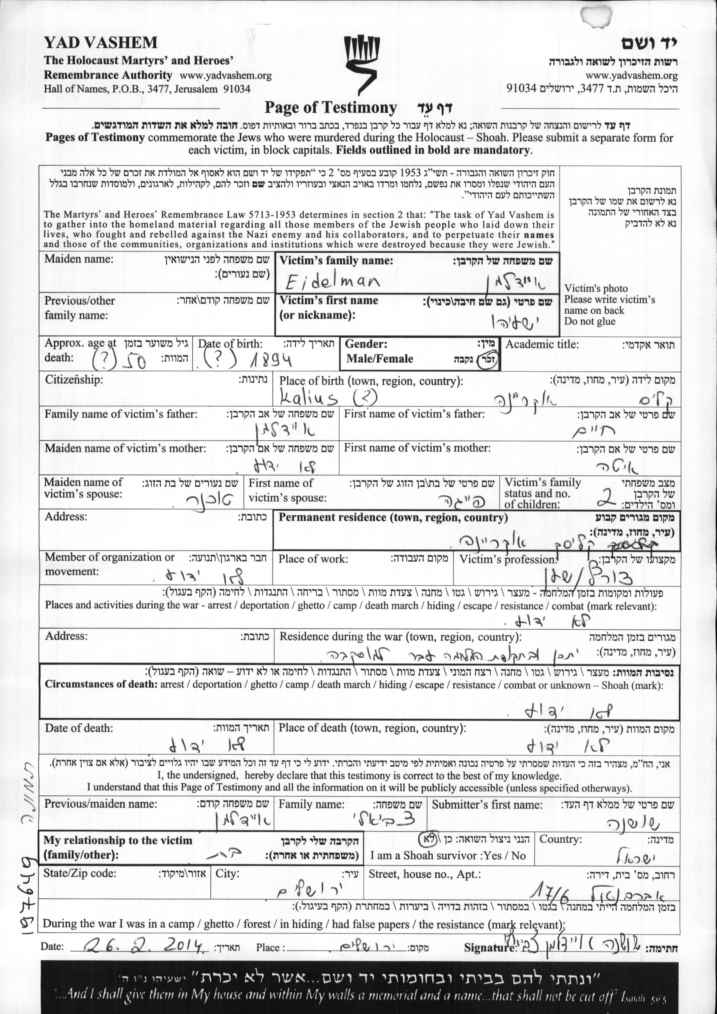 Yeshayahu Eidelman was born in Kalyus, Ukraine (USSR), 1894. He was a watchmaker / silversmith. Prior to WWII he lived in Kalyus, Ukraine (USSR). Yeshayahu was murdered in the Shoah. Place of death: unstated place.